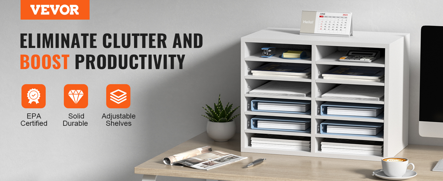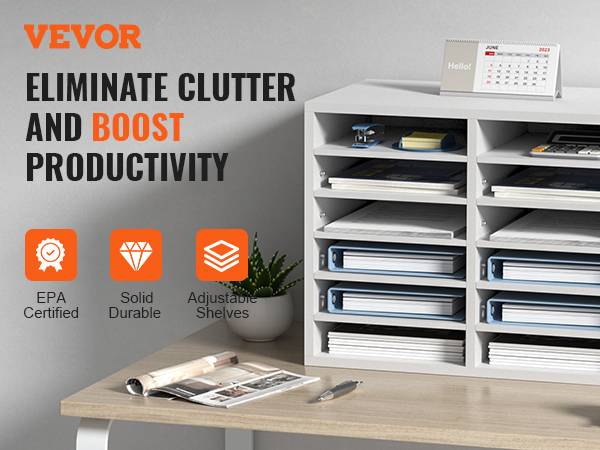 • Maksimāli izmantojiet savu telpu: Atvadieties no nekārtīgiem rakstāmgaldiem ar VEVOR 20,4”x12”x16,1” koka dokumentu organizatoru. Tam kopumā ir 12 nodalījumi, kas izvietoti 6 rindās un 2 kolonnās. Jums būs pietiekami daudz vietas grāmatu, dokumentu, žurnālu, papīru un citu materiālu glabāšanai un organizēšanai. Uzturiet savu darba vietu kārtīgu un sakoptu viegli.