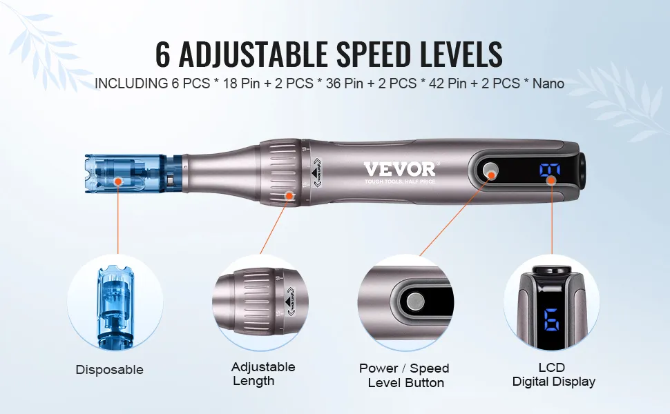 Mūsu mikroadatu sistēmai ir 6 regulējami ātrumi, lai pielāgotos dažādām ārstēšanas vajadzībām, un LCD displejs intuitīvai ātruma līmeņa kontrolei. Regulējamais adatu garums no 0 līdz 2,5 mm ļauj pielāgot procedūru optimāliem rezultātiem.