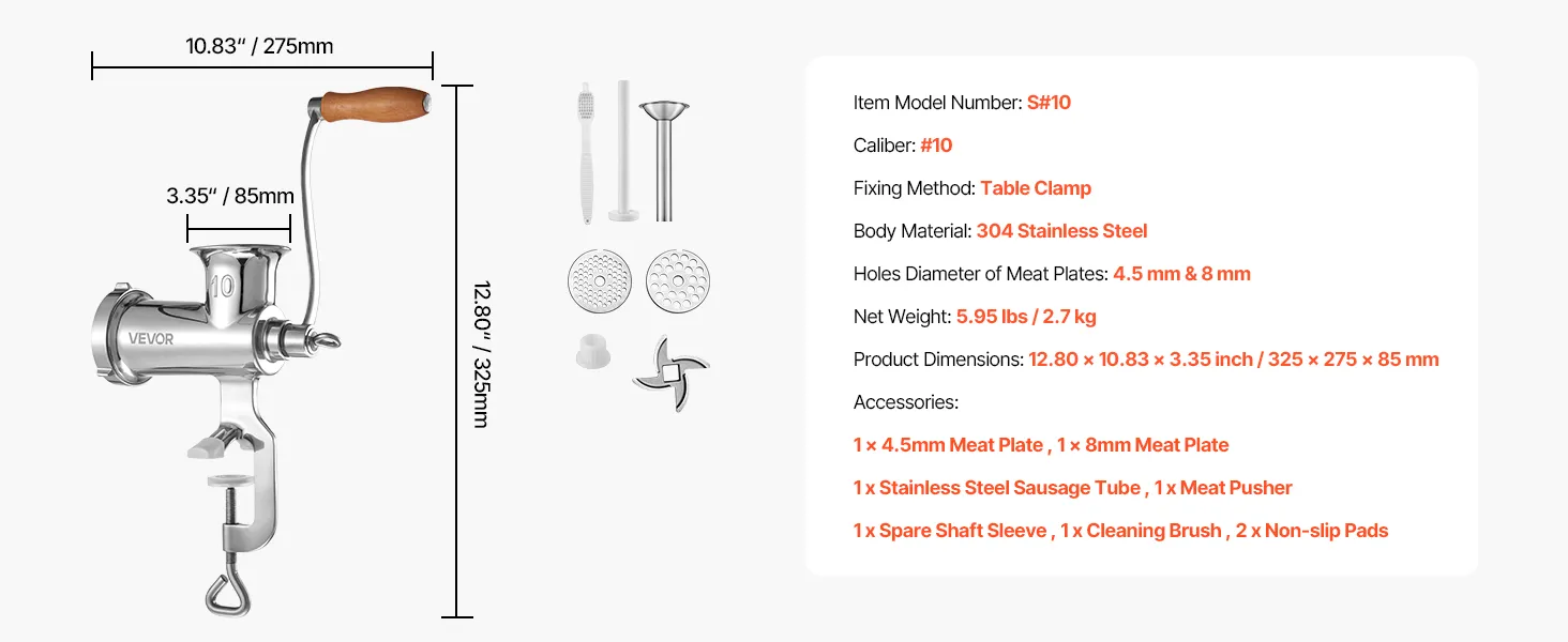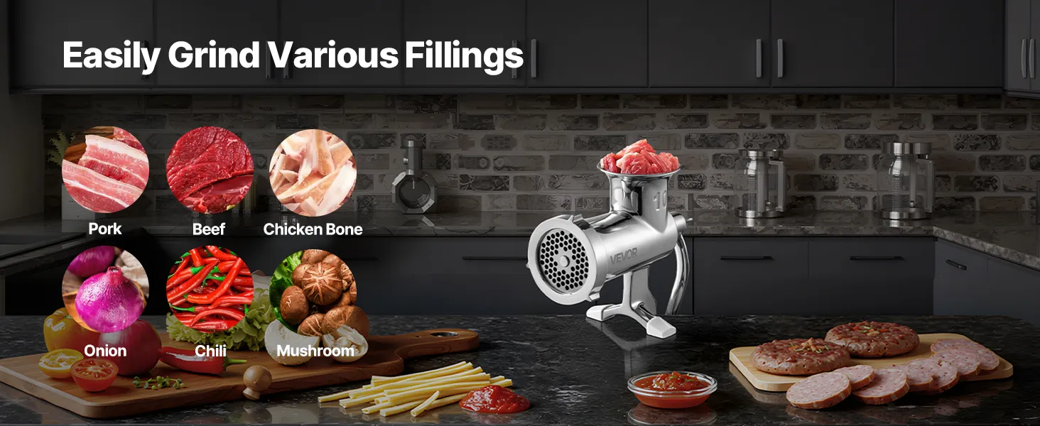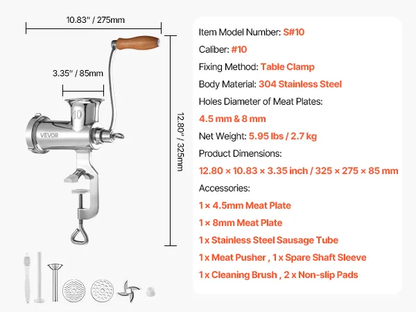 VEVOR 304 nerūsējošā tērauda manuālā gaļas maļamā mašīna ir daudzpusīgs un praktisks virtuves rīks, kas nodrošina ērtības mājās gatavotu kulinārijas gardumu pagatavošanai. Tā ir aprīkota ar spēcīgu tērauda galda skavu fiksāciju, kas nodrošina gan stabilitāti, gan uzticamību. Uzlabojiet savu ēdiena gatavošanu ar nebeidzamu jautrību un radošumu!
