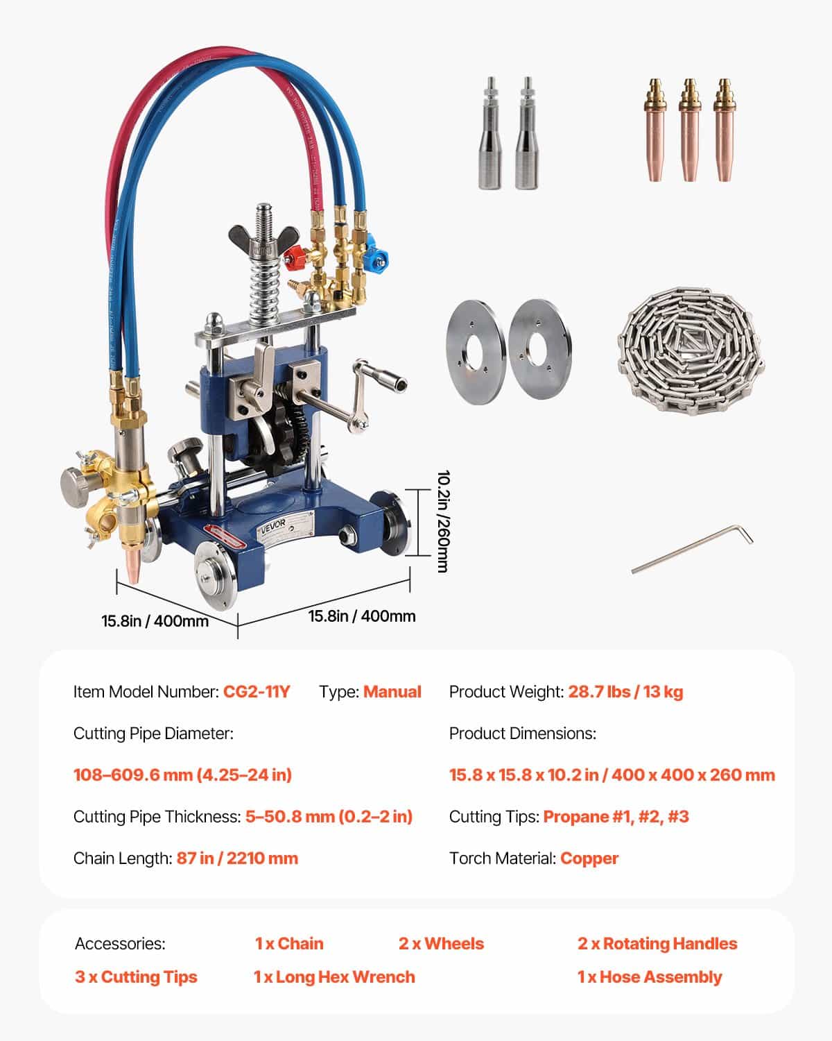 VEVOR CG2-11Y Manuālā cauruļu griešanas mašīna, 0,2 "-2" bieza cauruļu slīpēšanas mašīna ar 82 collu ķēdi, 0°-45° noregulēta leņķa gāzes griešanas mašīna ar 3 padomiem, pārnēsājams degļa slīpuma gāzes griezējs