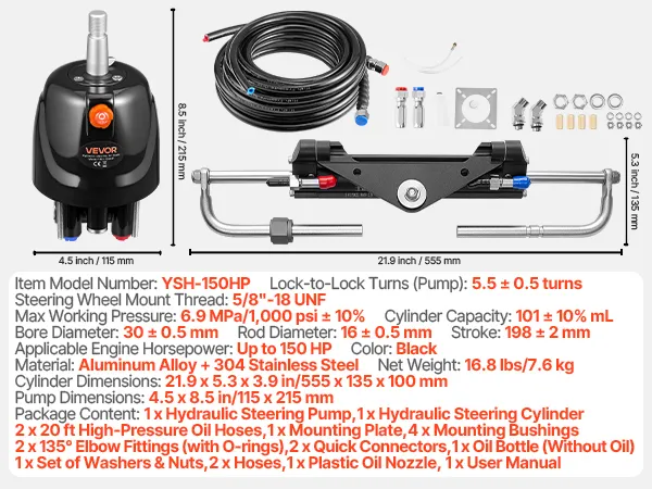 VEVOR Hydraulic Steering Kit, 110kW (150 HP), Marine Boat Hydraulic Steering System, with 6.9 MPa/1000 psi Helm Pump, Two-Way Lock Cylinder, and 6 m High-Strength Hoses, for Single Station, Single-Engine Use