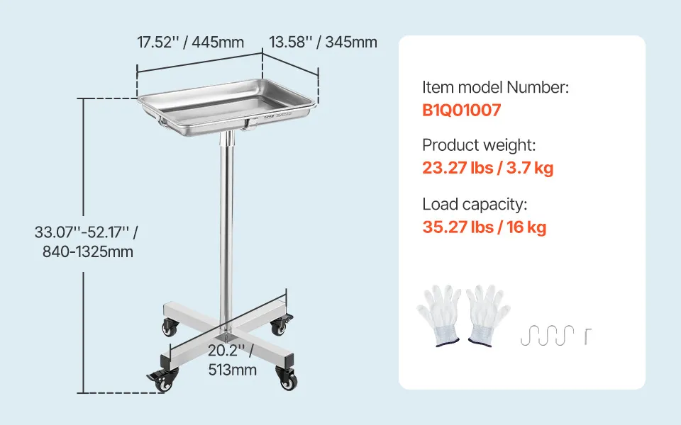VEVOR Mayo Stand, Stainless Steel Mayo Tray, Load Capacity up to 35 lbs, Adjustable Height 25.2"-39.8", Medical Tray on Wheels with Removable Tray for Spa, Salon, Clinic, Personal Care