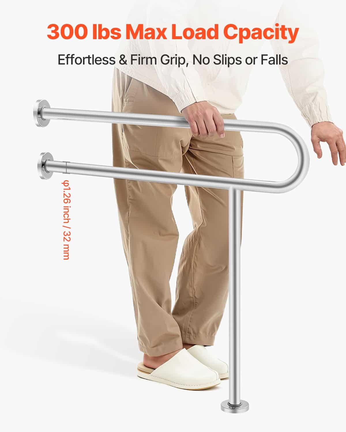 Our toilet safety rail with leg has a robust support capacity of 300 lbs, assisting in bathroom, restroom, etc. With T-shaped design, it is ideal for secure floor installation, ensuring enhanced stability and durability. Crafted from 304 stainless steel, it offers you enduring, dependable support.