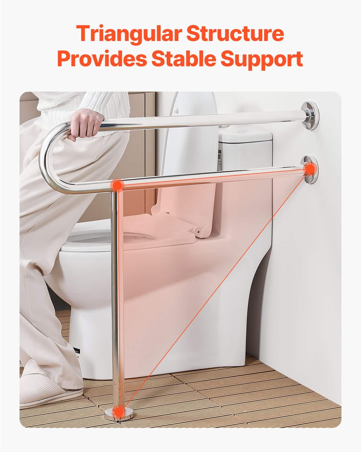 This floor-standing safety handrail features a tri-point stable support structure with an added vertical load-bearing element at the handle's stress point. This design distributes the force more evenly, providing long-lasting and reliable support.