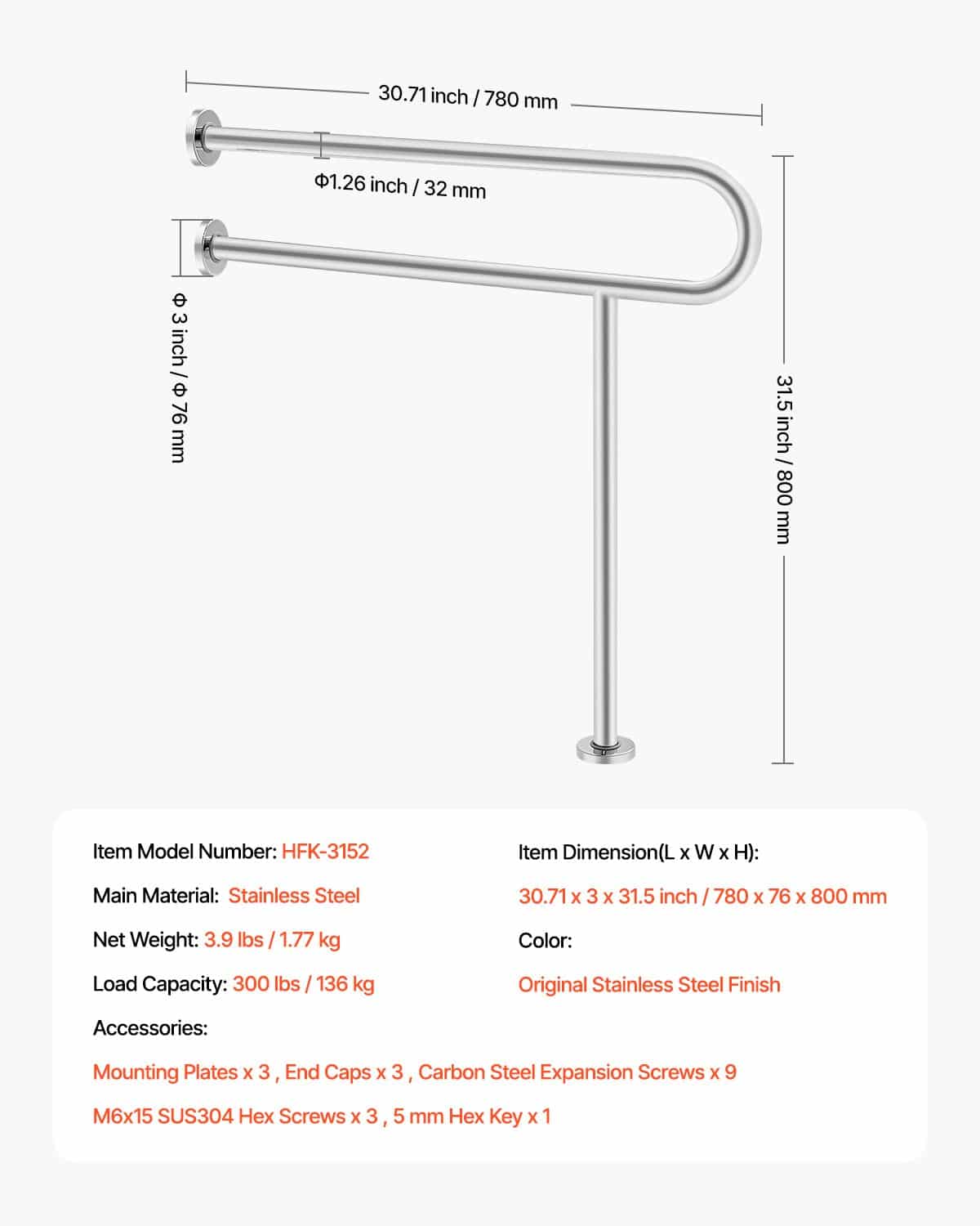 VEVOR Toilet Safety Rail, 31.5 Inch U-Shaped Handicap Grab Bar, 304 Stainless Steel Senior Safety Pole, Toilet Grab Bars with Anti-Slip Handle, 300 Lbs Load Capacity Security Handrail with Support Leg