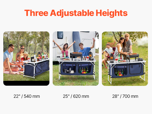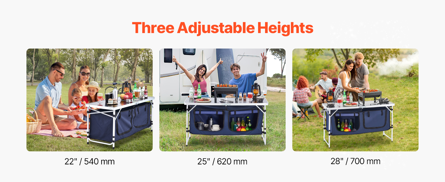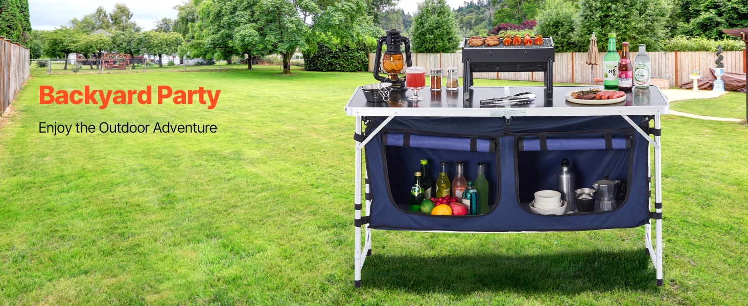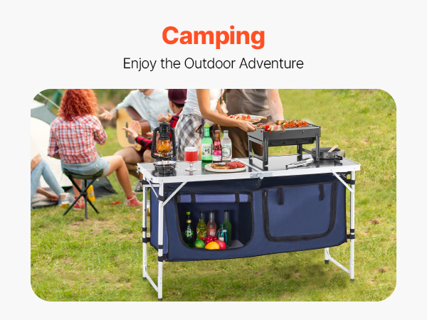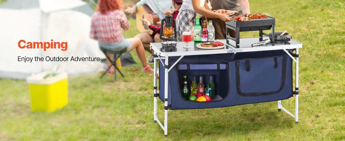 VEVOR Camping Kitchen Table, Folding Outdoor Cooking Table, 3 Adjustable Height, Aluminum Lightweight Portable Cook Station with Storage Organizer, Carry Handle, for BBQ Party Picnic RV Travel, Blue