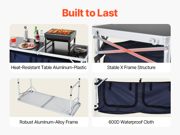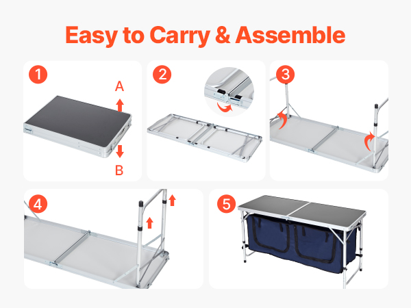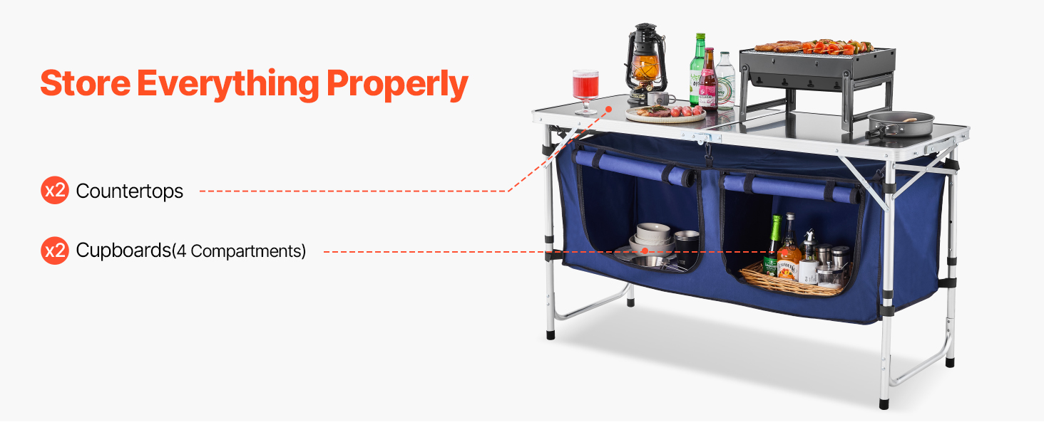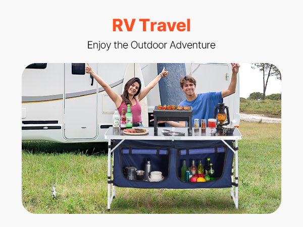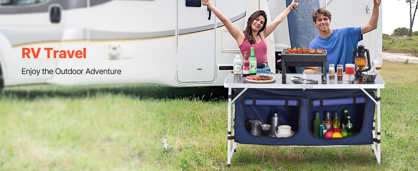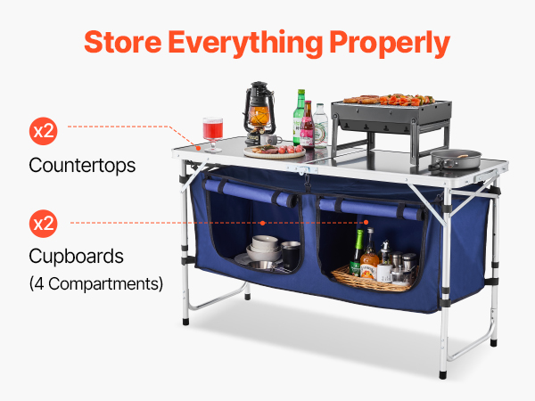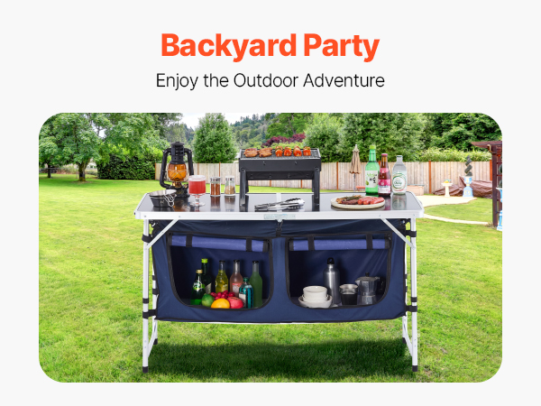 VEVOR Camping Kitchen Table, Folding Outdoor Cooking Table, 3 Adjustable Height, Aluminum Lightweight Portable Cook Station with Storage Organizer, Carry Handle, for BBQ Party Picnic RV Travel, Blue