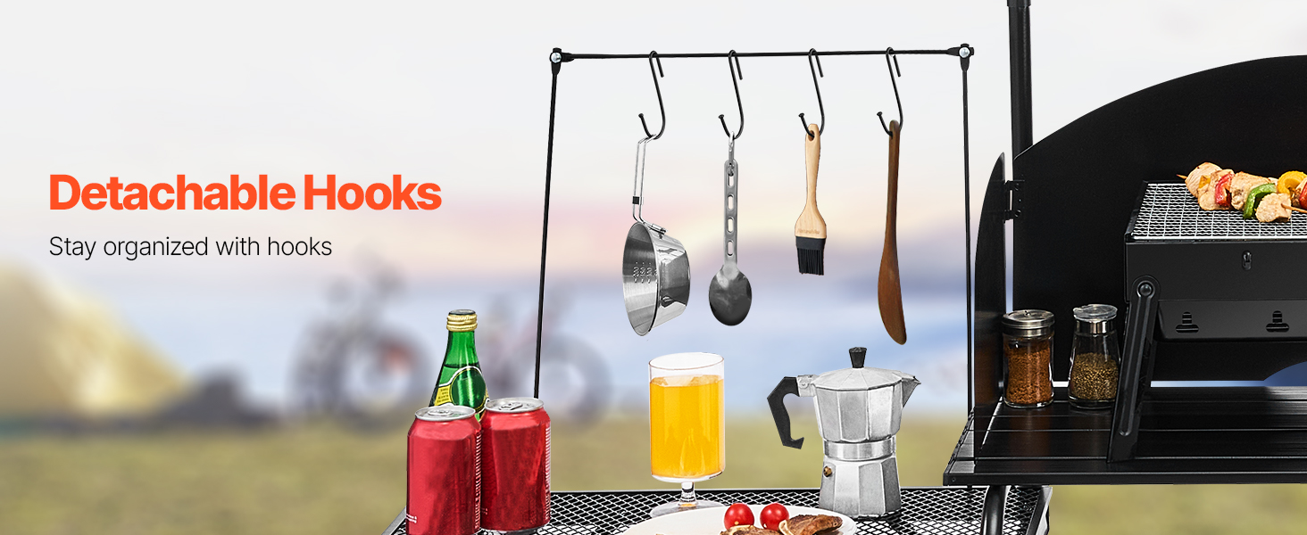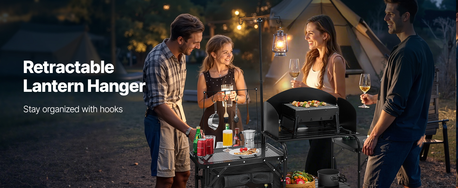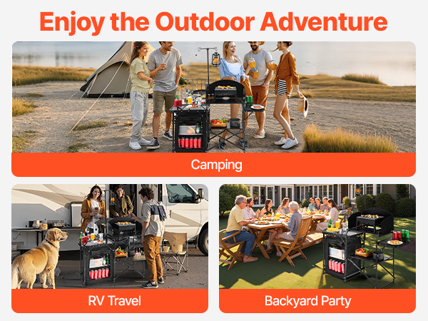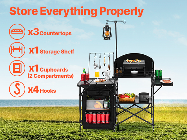 Kempinga virtuves galds ievērojami palielina jūsu uzglabāšanas vietu, ļaujot jums pārnēsāt pēc iespējas vairāk sastāvdaļu un virtuves piederumu. Tas ir arī viegli tīrāms.