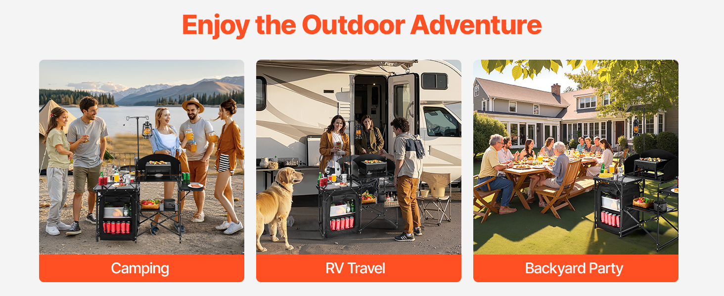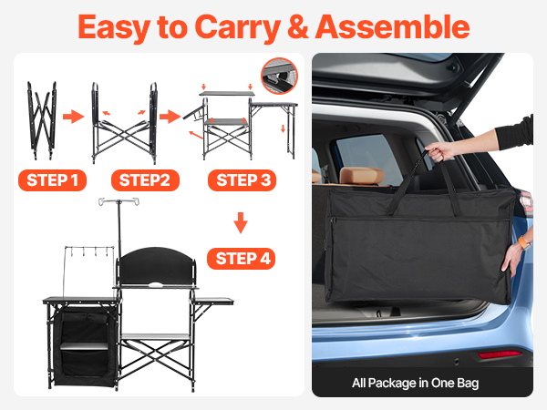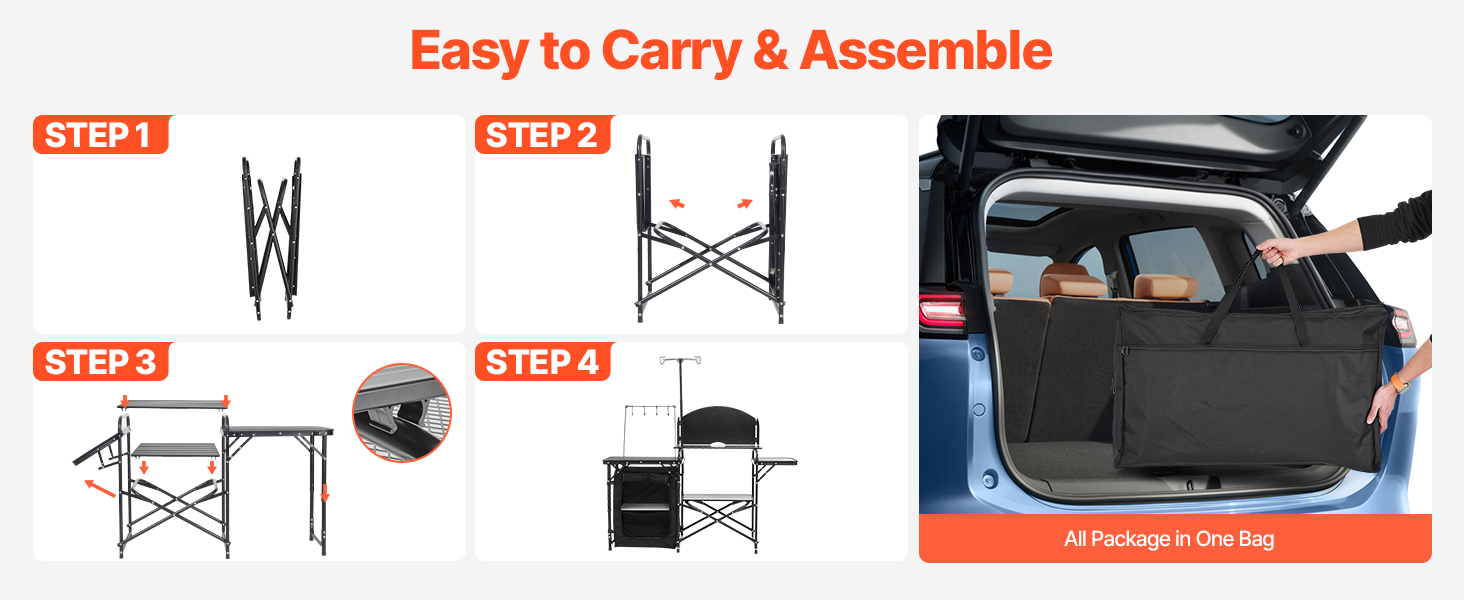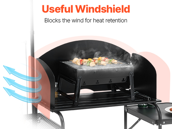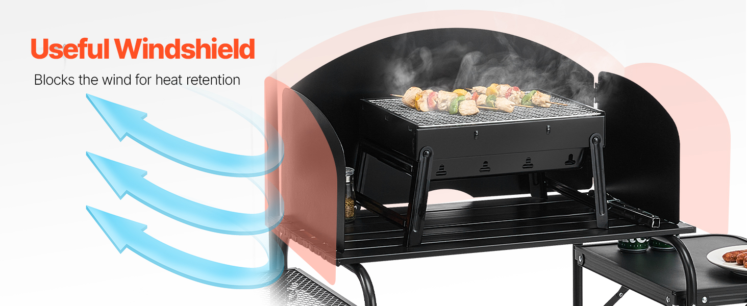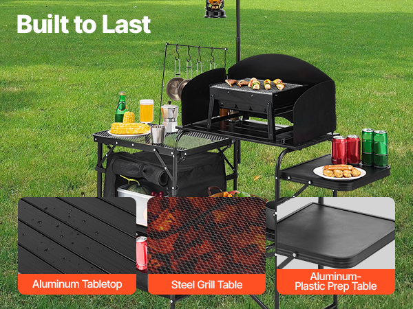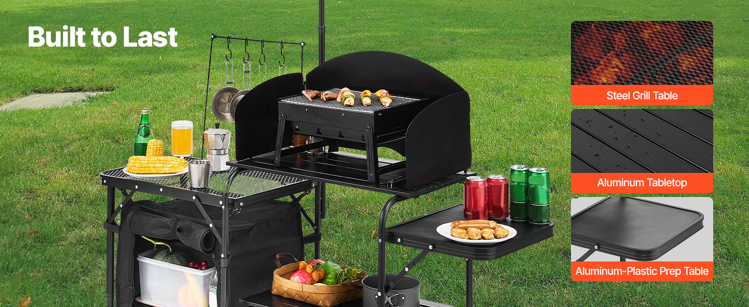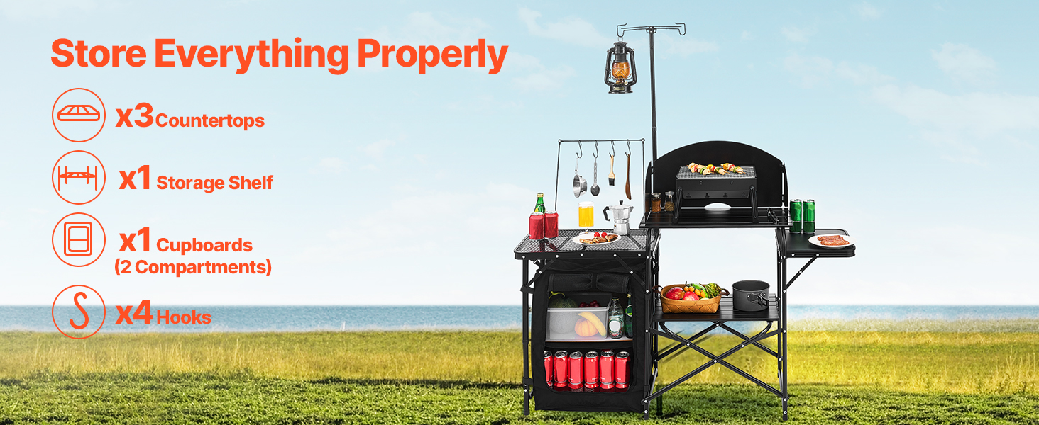 VEVOR Camping Kitchen Table, Outdoor Camp Cooking Table, Aluminum Portable Cook Station with Storage Cupboard, Carrying Bag, Detachable Windscreen, Quick Set-up for BBQ Party Picnic RV Travel, Black