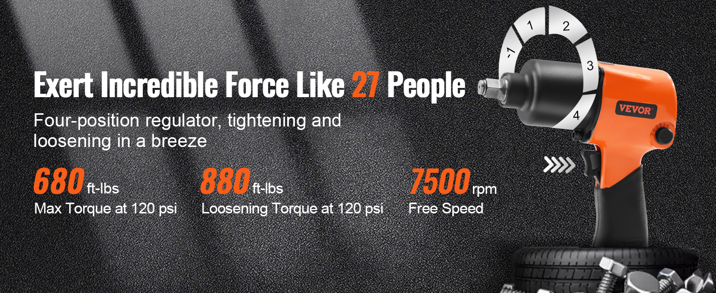 7500 apgr./min brīvgaitas ātrums un 880 pēdu mārciņu atskrūvēšanas griezes moments, kas atbilst 27 cilvēku kopīga darba spēkam, spītīgām skrūvēm un uzgriežņiem.