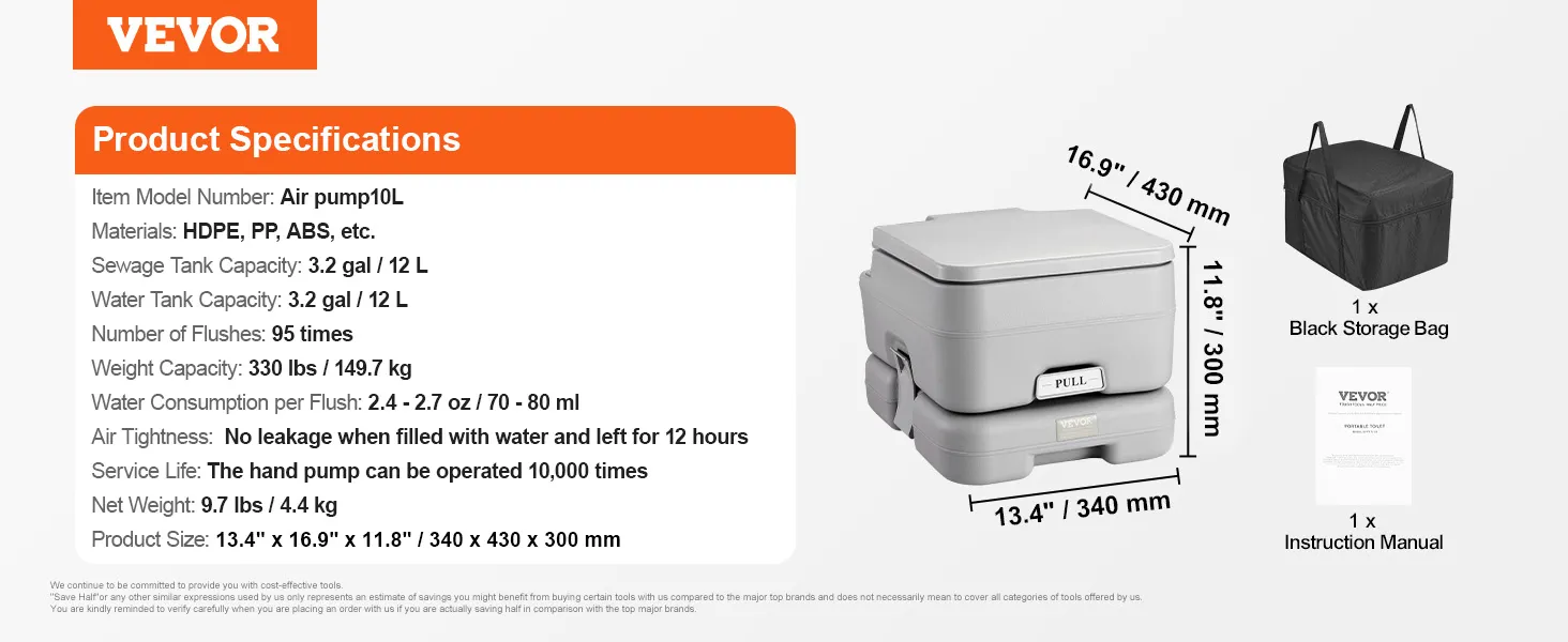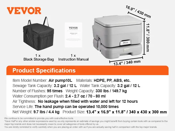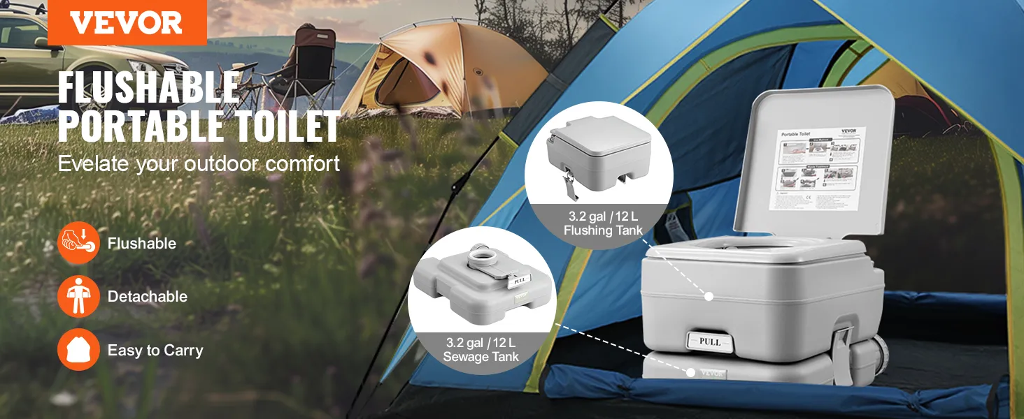 VEVOR Portable Toilet for Camping with Carry Bag, RV Toilet with 3.2 Gal Waste Tank, Push-Button Pressurized Flush Commode, Leak-proof and Odourless Travel Toilet for Adults Kids Camping Car