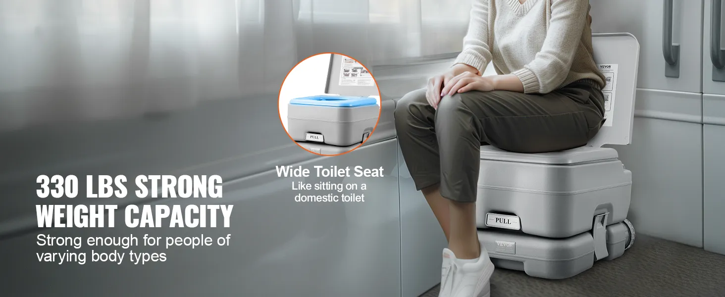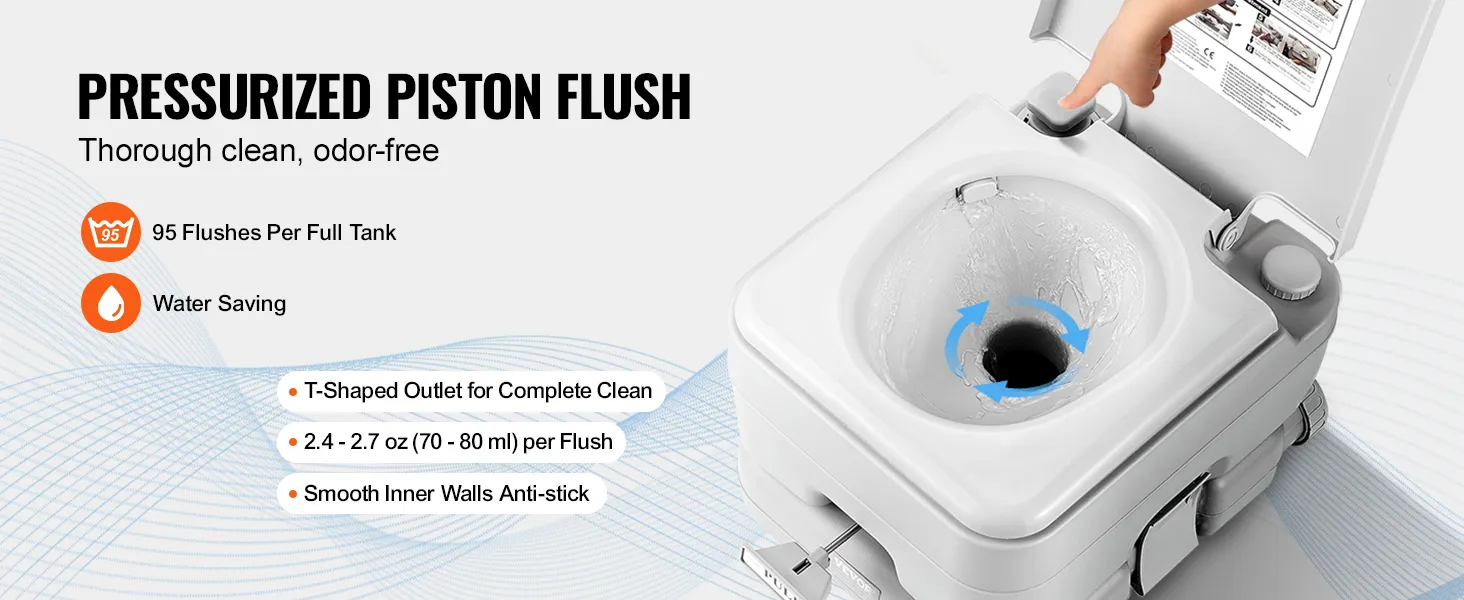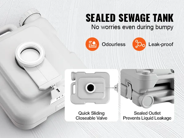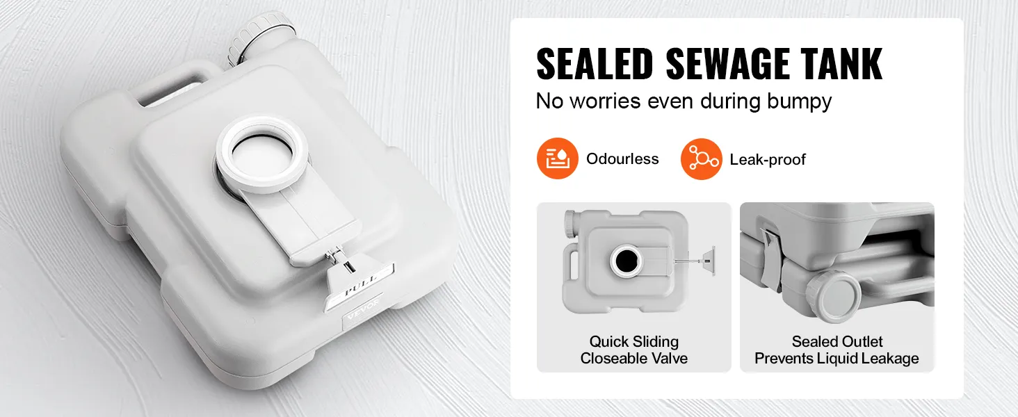 This camping toilet's waste tank is designed to prevent leaks and spills. The water level indicator to timely alert for sewage disposal. The vent valve balances pressure differences, preventing overflow. The push-pull sealed drain valve effectively reduces odors and sewage leakage.