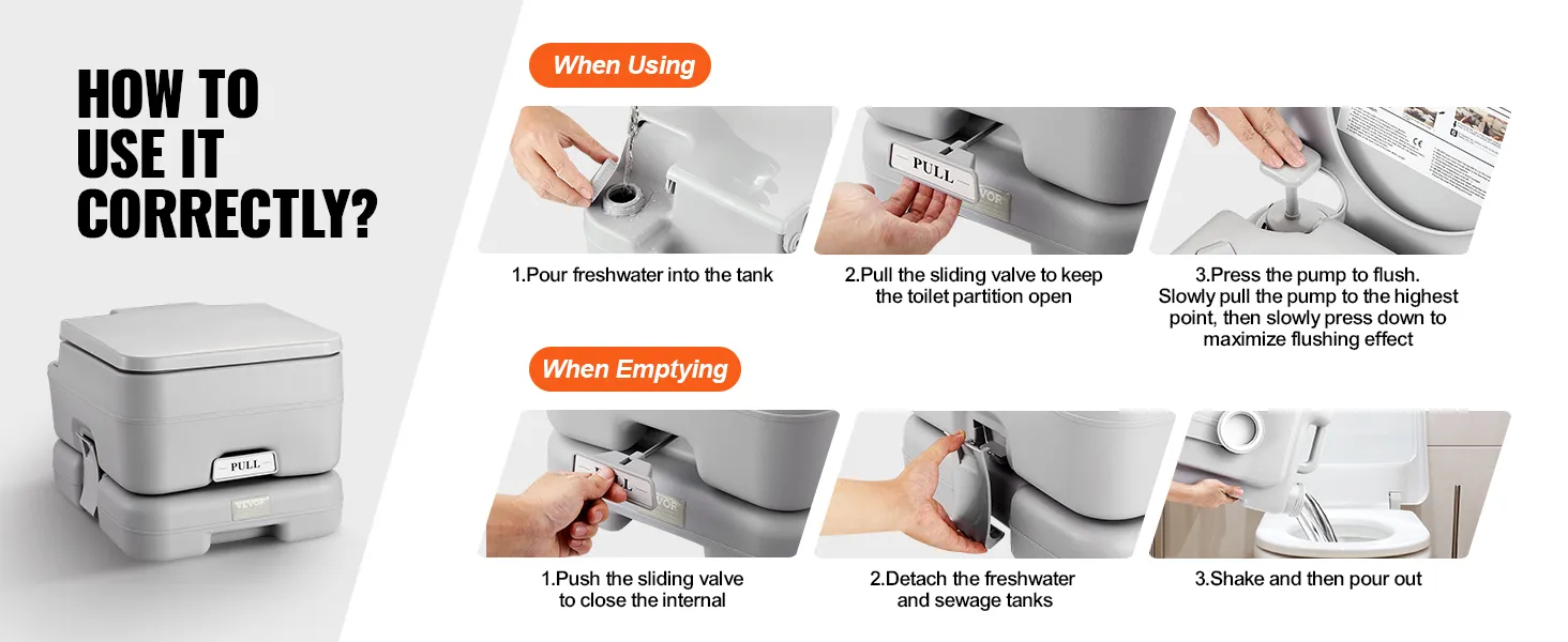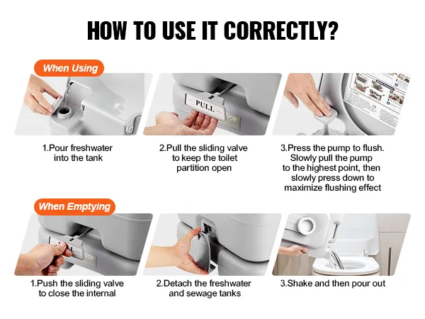 Šo noņemamo komposta tualeti ir vienkārši lietot. Vienkārši piepildiet to ar ūdeni un pabīdiet vārstu, lai atvērtu iekšējo starpsienu, padarot kempera tualeti gatavu lietošanai.