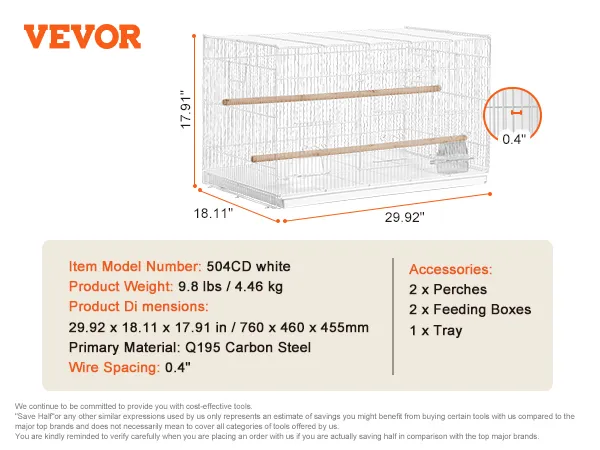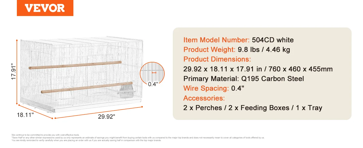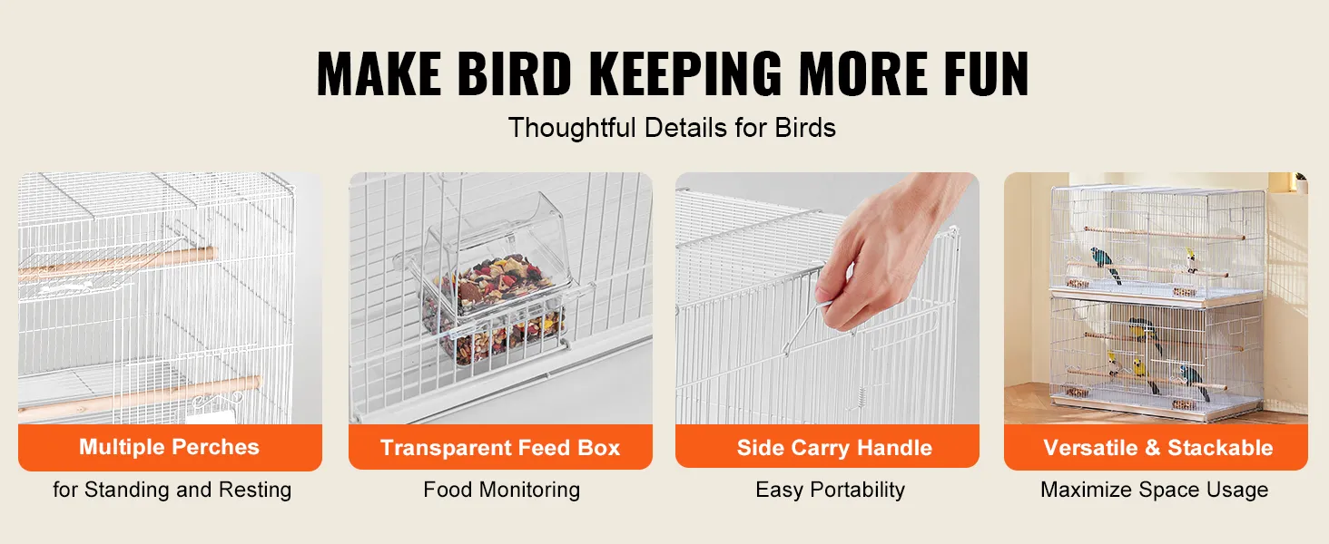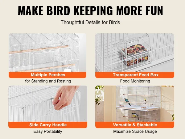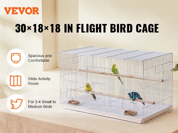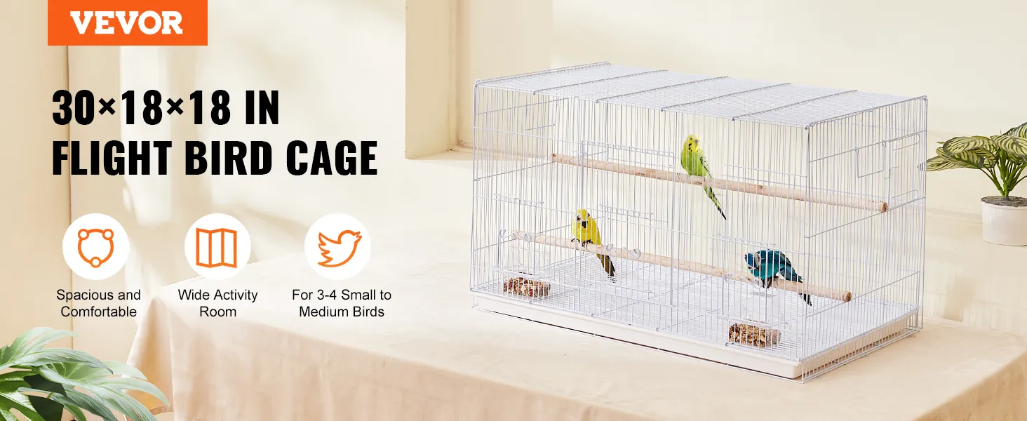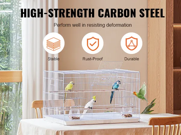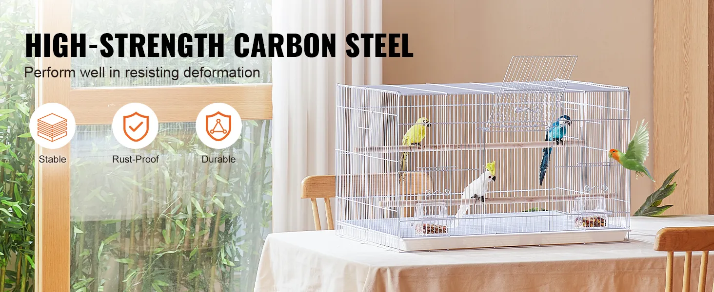The birdcage with a large space of 30x18x18 inches, is sturdy and stable in structure. It features a secure door design, making it easy for you to open and close the cage, which is helpful for daily feeding, cleaning, and management. The cage provides a secure and healthy home for birds.