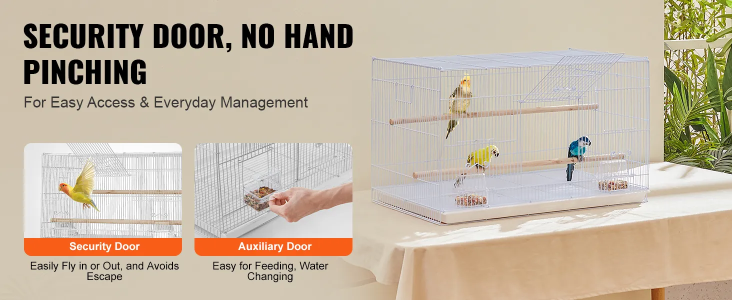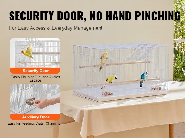 Galvenajām durvīm ir drošas durtiņas barošanas, tīrīšanas un apkopes darbiem, vienlaikus novēršot putna aizbēgšanu. Palīga durvju dizains ļauj kopējam viegli pievienot barību vai mainīt putnam dzeramo ūdeni, pilnībā neatverot būri.