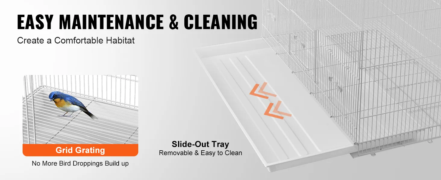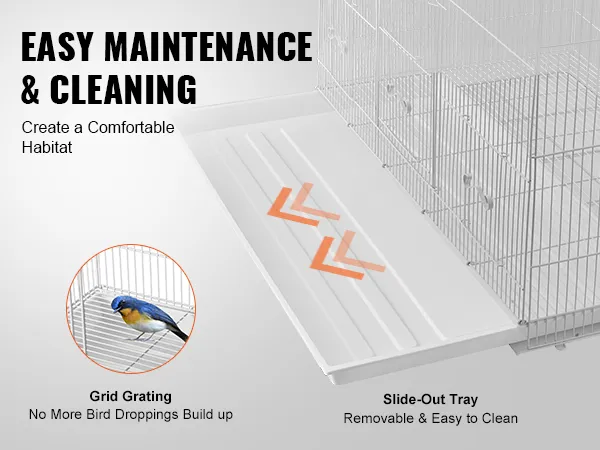 Ūdensnecaurlaidīgā apakšējā bīdāmā paplāte ir noņemama un viegli tīrāma. Režģis neļauj mājdzīvniekiem staigāt tieši pa izkārnījumiem. Vairs nebūs jāuzkrājas putnu mēsliem. Vispārējā tīrīšanas darbība ir vienkārša, un regulāra tīrīšana un apkope nodrošina mājdzīvnieka veselību.