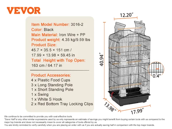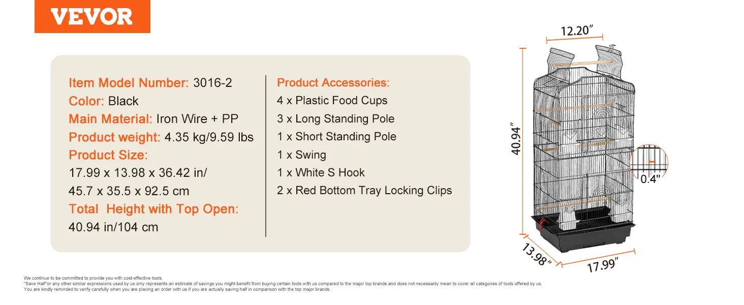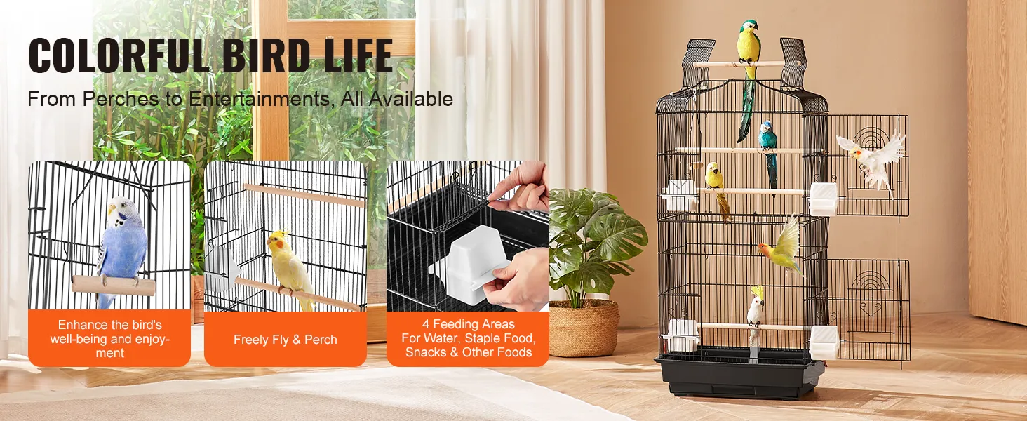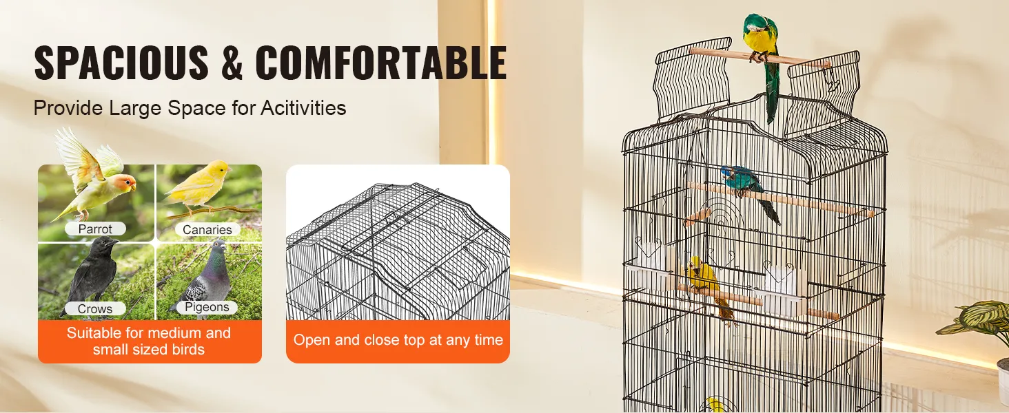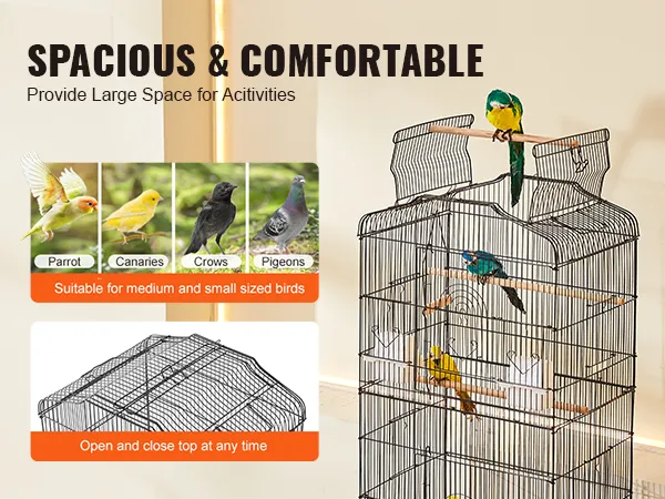 VEVOR 41-inch Open Top Large Parrot Bird Cage, Hanging Bird Cage for Parakeets Finches Canaries Lovebirds Cockatiels Budgies Small Quaker Conures Travel Pet Flight Birdcage with Swing and Perch