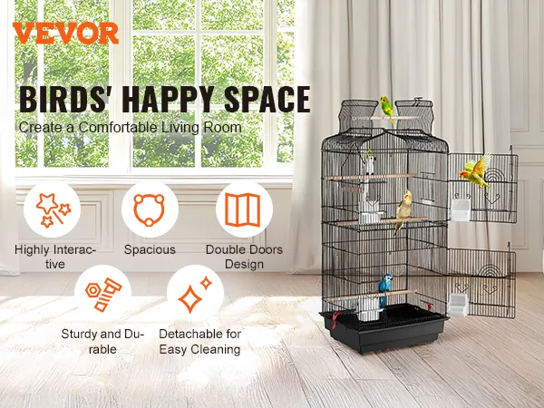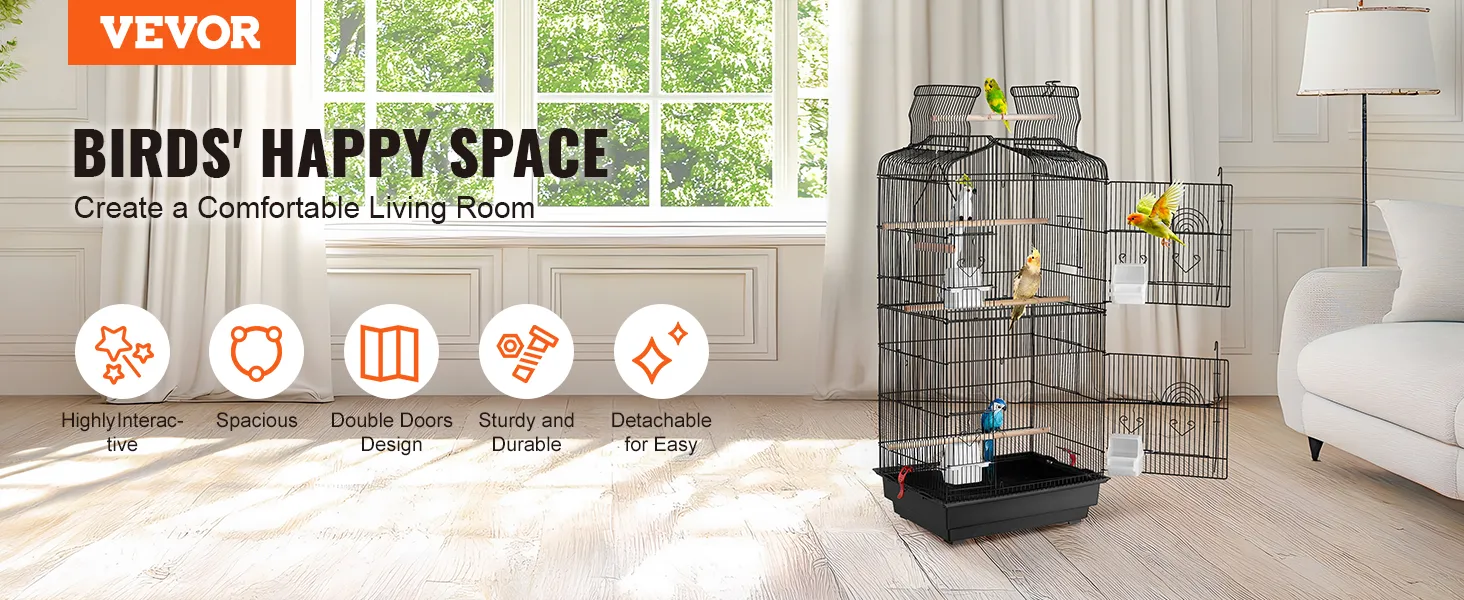 Šis putnu būris nodrošina plašu un ērtu dzīves telpu maziem un vidēja lieluma putniem. Augšpusi var atvērt, lai putni varētu brīvi lidot, un dubultās durvis atvieglo mijiedarbību. Atvilktnes formas paplāte atvieglo tīrīšanu, un izturīgā dzelzs stieple nodrošina ilgstošu izturību.