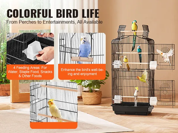 Aprīkots ar 4 barošanas vietām, lai apmierinātu nemierīga ūdens, pamatbarības un uzkodu vajadzības. Regulējams koka tupēšanas laukums ļauj putniem brīvi pārvietoties un atpūsties, un šūpoles ir īpaši izstrādātas, lai palielinātu laimi un vērošanu.