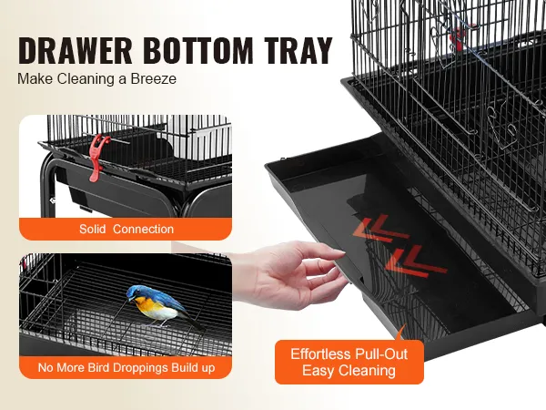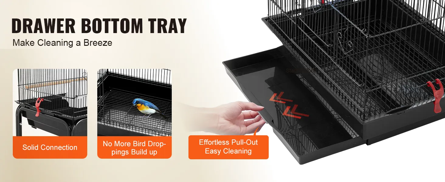Putnu būra tīrīšana vēl nekad nav bijusi tik vienkārša! Atvilktnes stila pamatnes dizainu var viegli izvilkt tīrīšanai, režģa režģis efektīvi novērš putnu mēslu uzkrāšanos un uztur būri tīru. Nodrošiniet saviem putniem tīru un ērtu dzīves vidi.