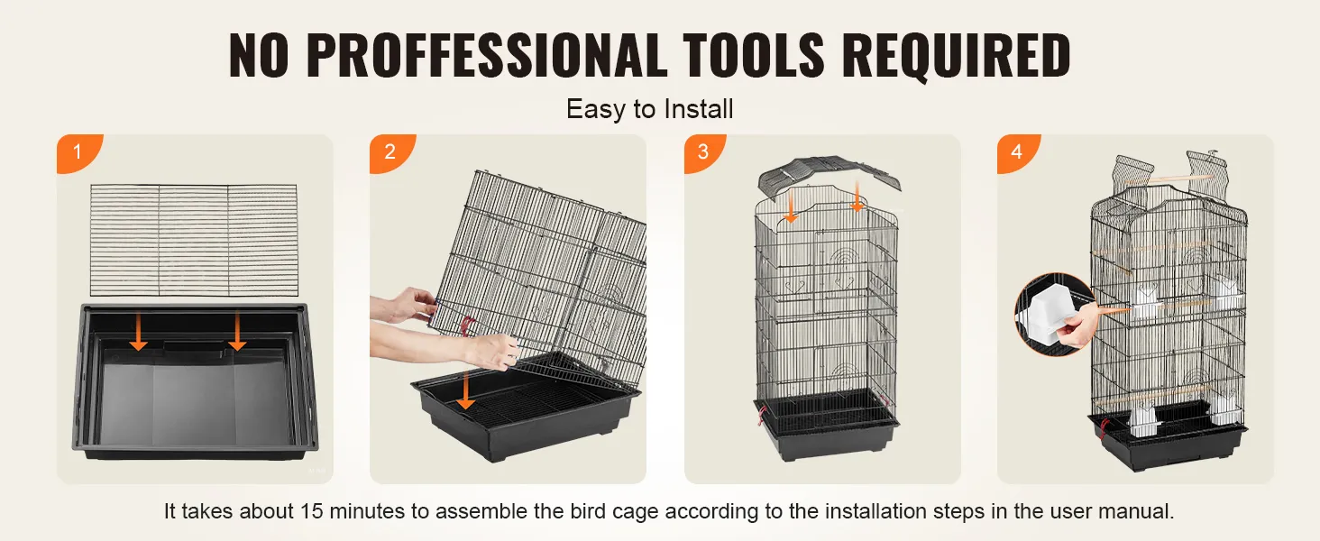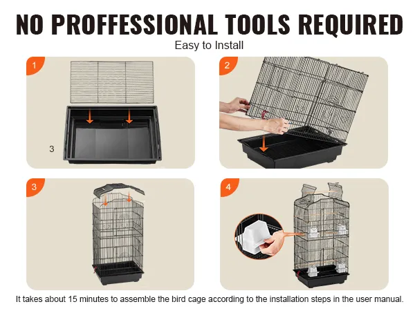 Šo papagaiļu putnu būri var viegli uzstādīt bez profesionāliem instrumentiem. Izbaudiet putnu audzēšanas prieku, nevis uztraucieties par sarežģītiem uzstādīšanas procesiem.