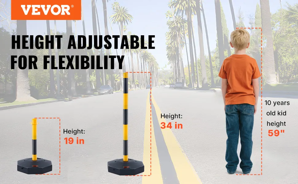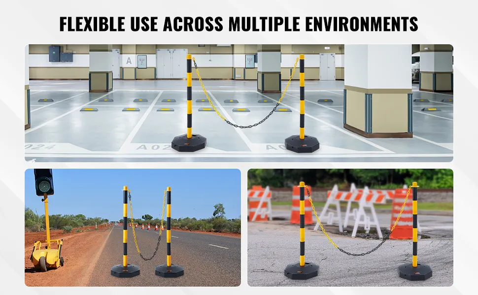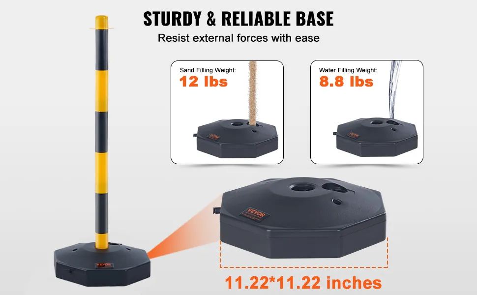 Mūsu satiksmes norobežojošajiem stabiem ir stabila pamatne ar izmēriem 11,22 x 11,22 collas, kas paredzēta stabilitātei un laika pārbaudei. Pielāgojiet stabu svaru, piepildot tos ar ūdeni (8,8 mārciņas) vai smiltīm (12 mārciņas).