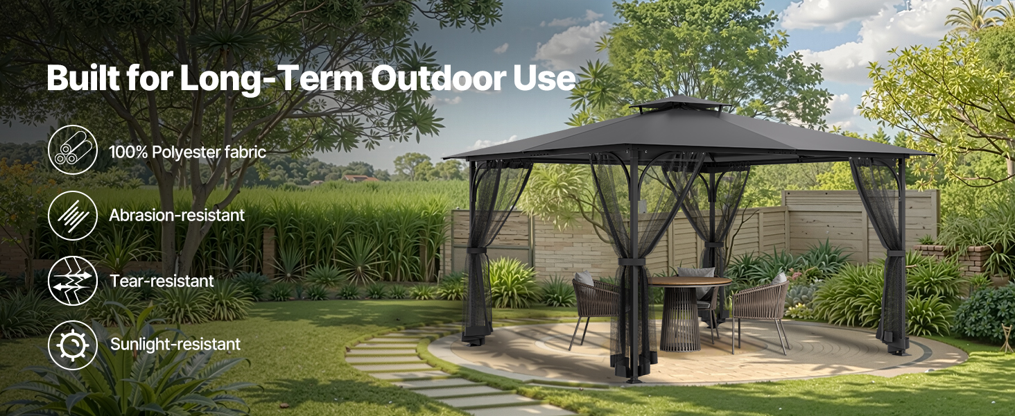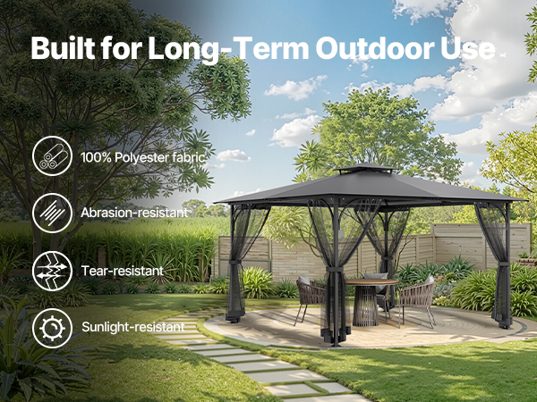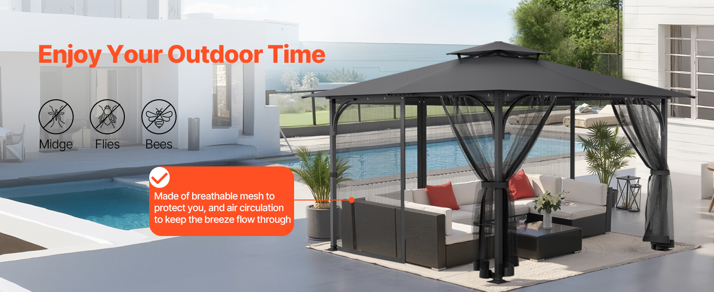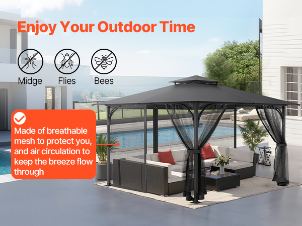 This gazebo net fit most 12×12×7.5ft gazebos, made from tear-resistant 100% polyester. It effectively blocks midges and provides privacy. Equipped with aluminum fixing holes, hooks, and rings for secure attachment. Washable for easy cleaning and storage. The double-sided zipper for convenience.