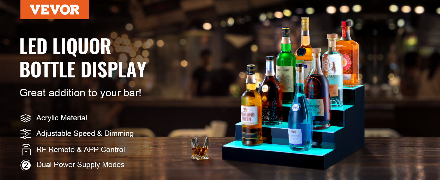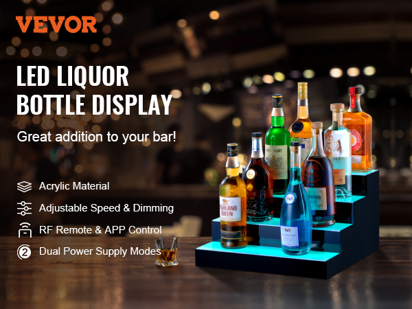 VEVOR LED Lighted Liquor Bottle Display, 4 Tiers 16 Inch Commercial Illuminated Home Bar Shelf, 4 Steps Whiskey Rack Stand, Acrylic Drink Shelves with RF Remote & App Control, and Multicolor lighting