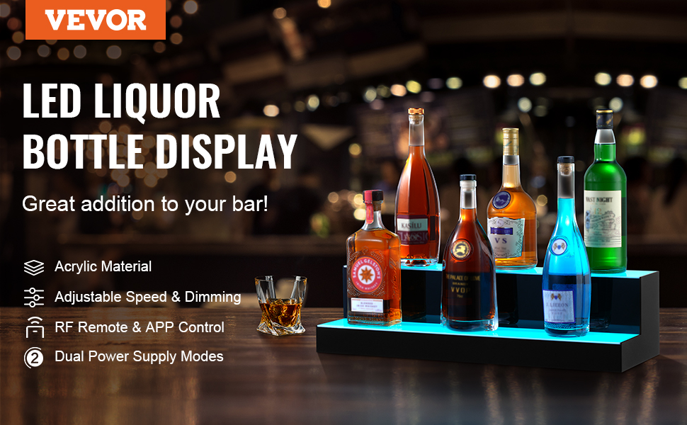 VEVOR LED Lighted Liquor Bottle Display, 2 Tiers 24 Inch Commercial Illuminated Home Bar Shelf, 2 Steps Whiskey Rack Stand, Acrylic Drink Shelves with RF Remote & App Control, and Multicolor lighting