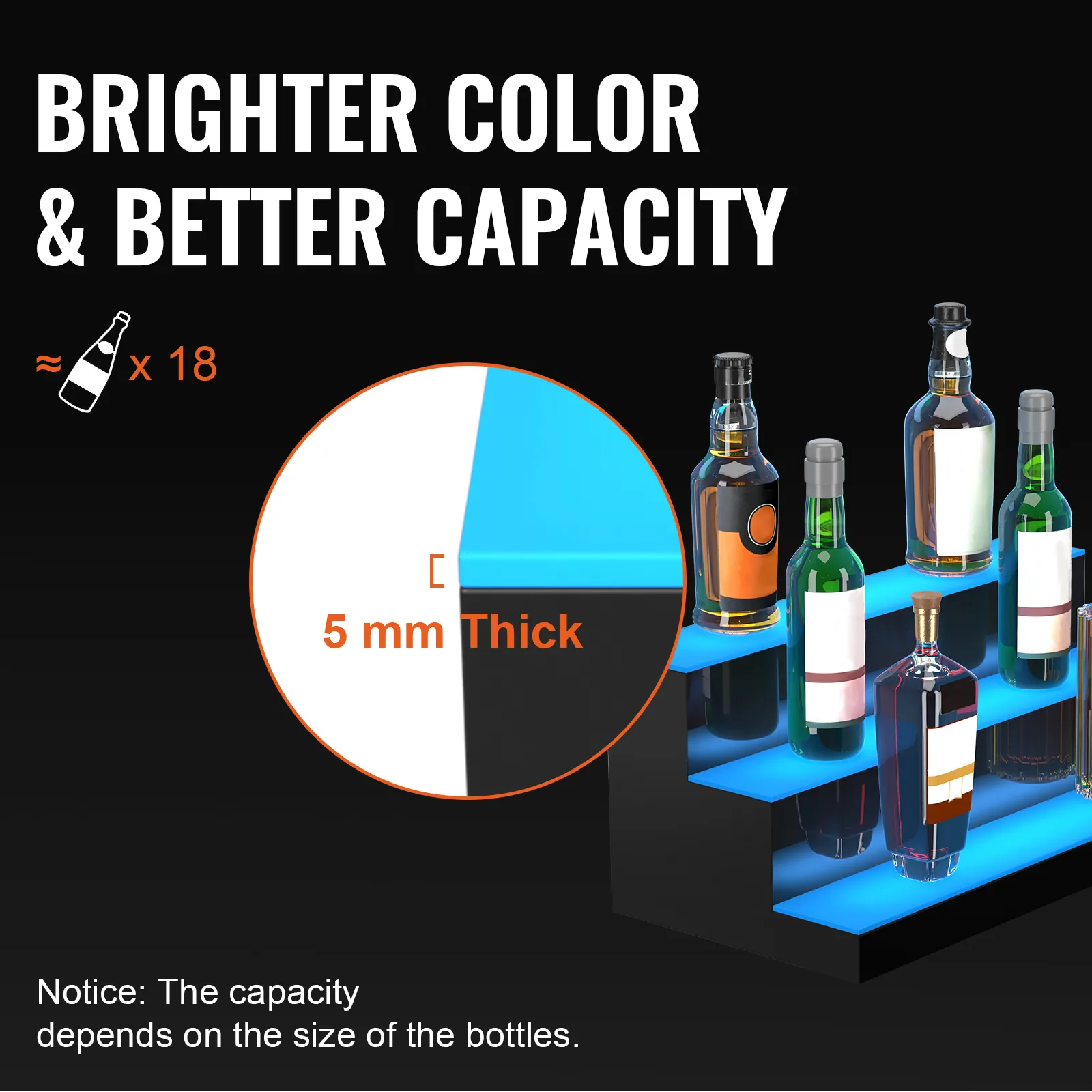 VEVOR LED Lighted Liquor Bottle Display, 3 Tiers 24 Inch Commercial Illuminated Home Bar Shelf, 3 Steps Whiskey Rack Stand, Acrylic Drink Shelves with RF Remote & App Control, and Multicolor lighting