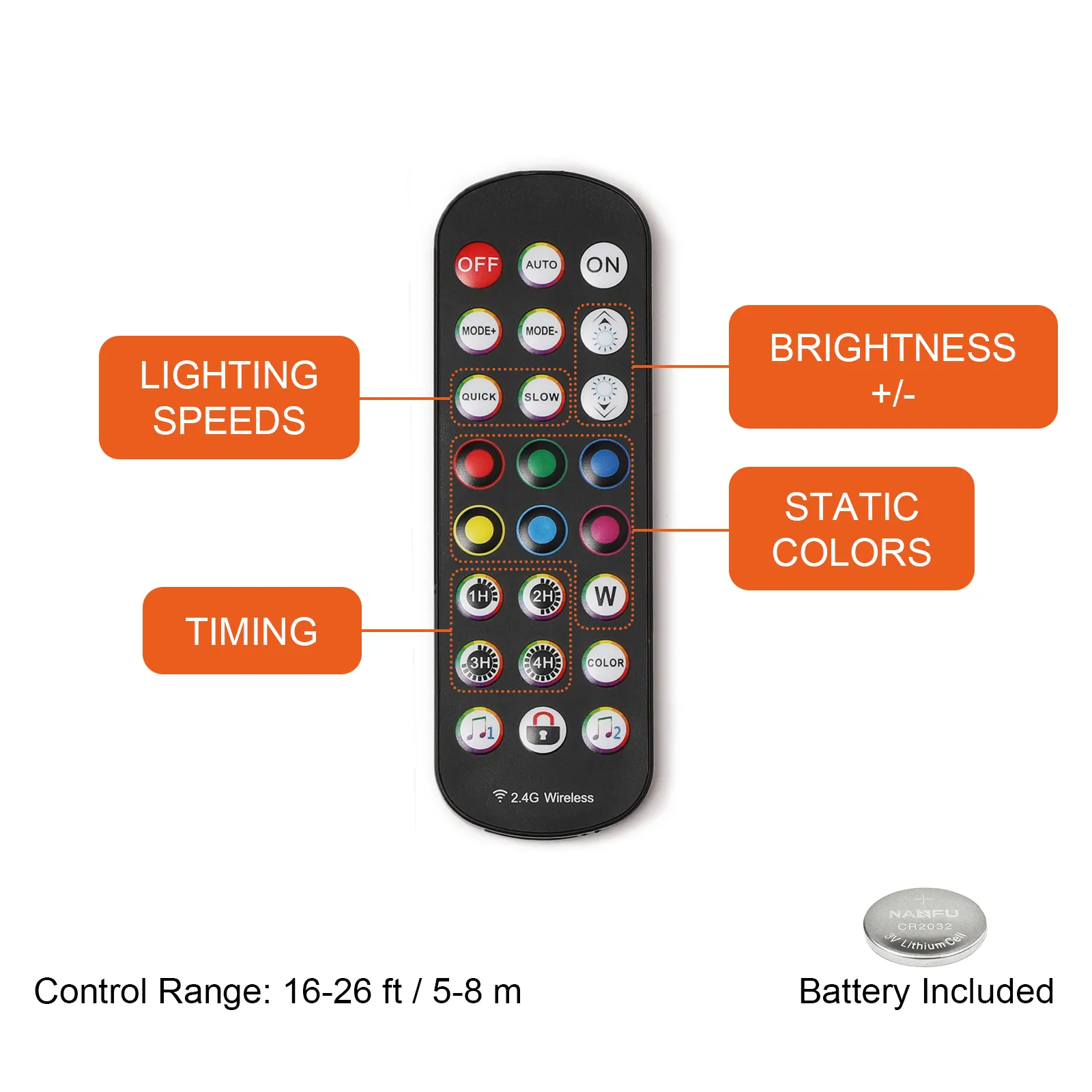 Infrasarkanās gaismas vietā mūsu tālvadības pults izmanto radio sakarus, kas reaģē ātrāk. Jūs varat kontrolēt bāra plaukta krāsas un režīmus, atrodoties atsevišķās telpās.