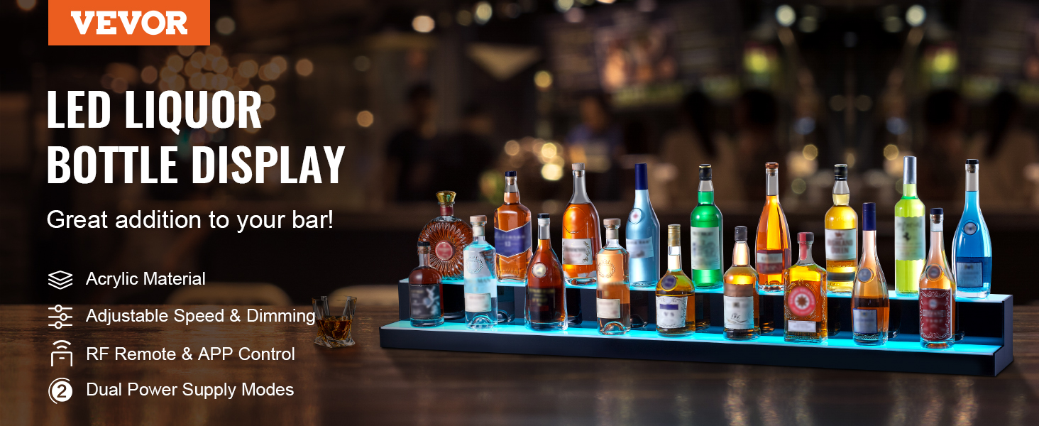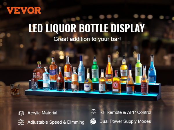 VEVOR LED Lighted Liquor Bottle Display, 2 Tiers 60 Inch Commercial Illuminated Home Bar Shelf, 2 Steps Whiskey Rack Stand, Acrylic Drink Shelves with RF Remote & App Control, and Multicolor lighting