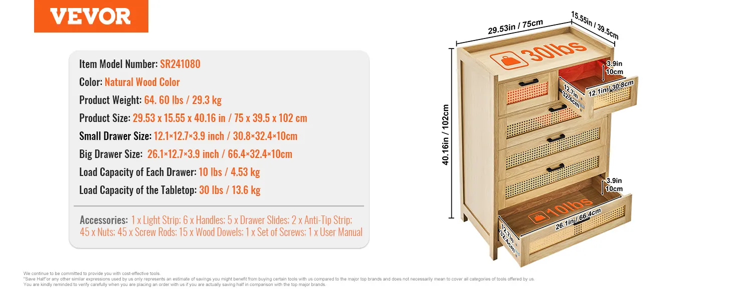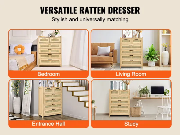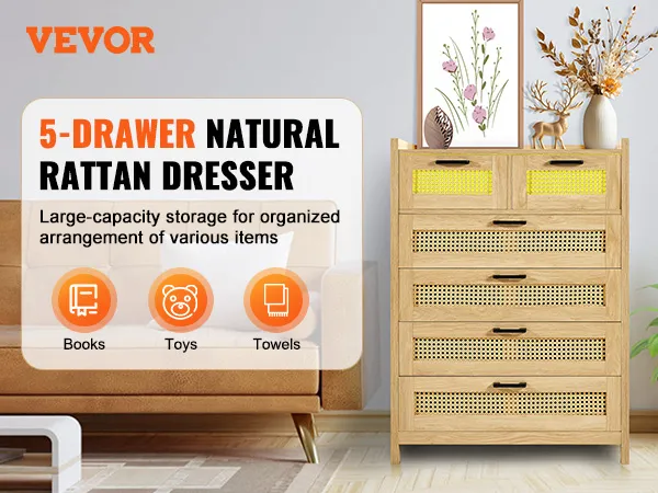 • Liela uzglabāšanas ietilpība: šai rotangpalmas kumodei ir piecas ietilpīgas atvilktnes, kas ir ideāli piemērotas telpas sakārtošanai. Neatkarīgi no tā, vai tā atrodas guļamistabā, viesistabā vai gaitenī, tā ir šika papildierīce, kas var izturēt līdz 10 mārciņām katrā atvilktnē un 30 mārciņām augšpusē – ideāli piemērota ikdienas lietošanai.