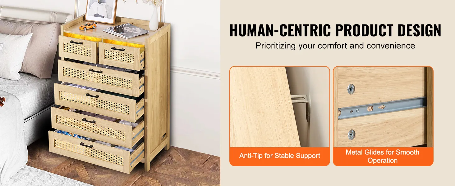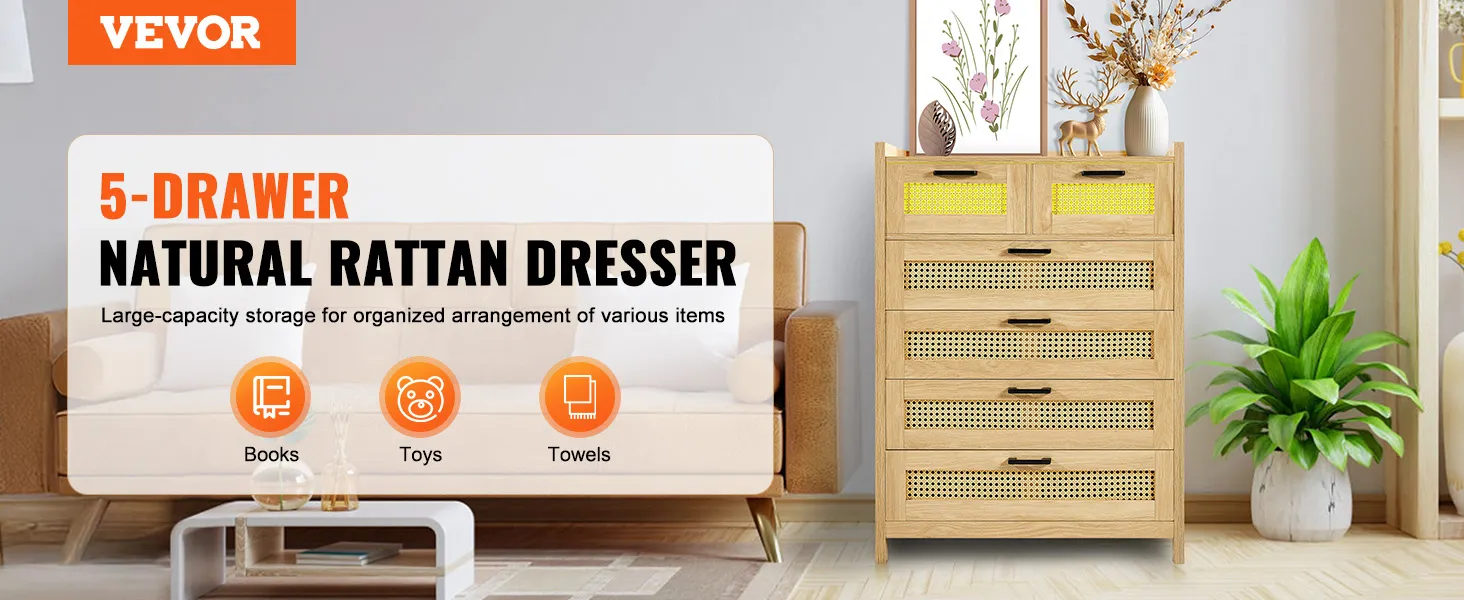 VEVOR dabīga rotangpalmas kumode ar 5 atvilktnēm, LED apgaismojumu, drošības fiksatoru, koka rāmis, guļamistabai vai viesistabai