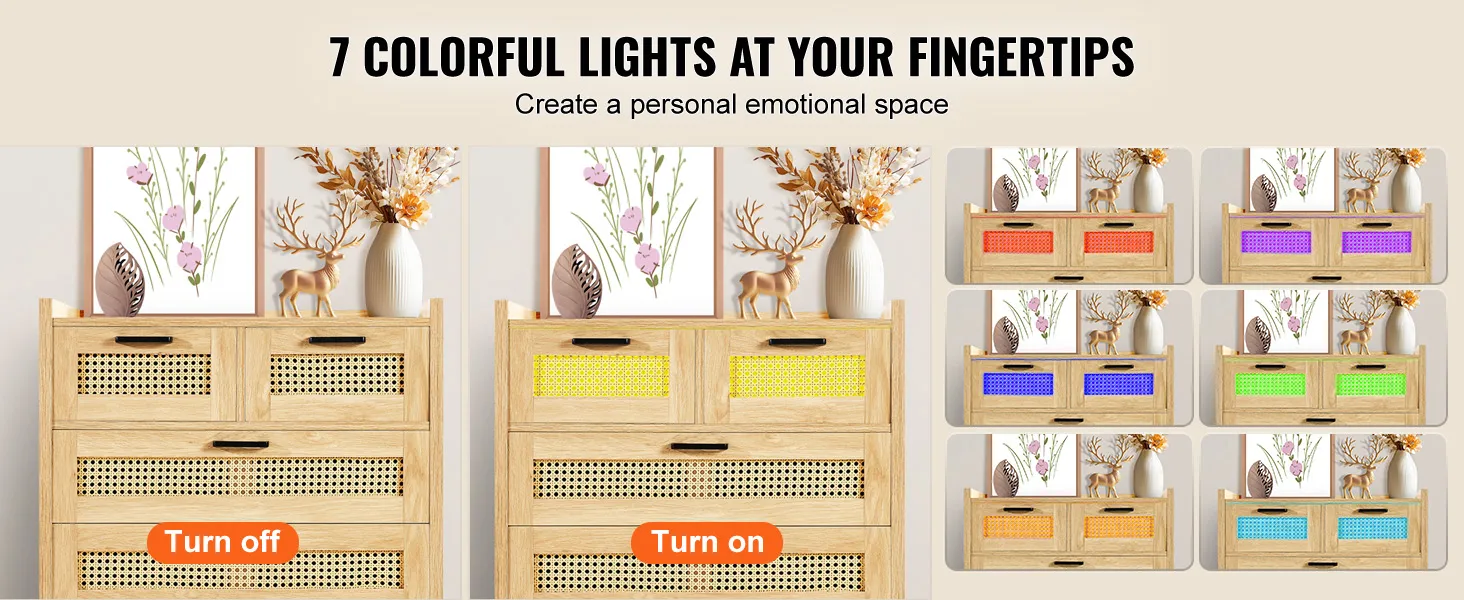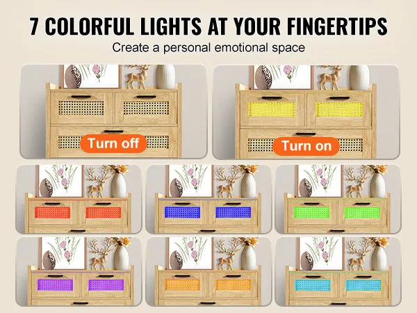 • Krāsaina LED atmosfēra: pārveidojiet savu telpu ar šo daudzpusīgo rotangpalmas kumodes skapīti, kas piedāvā septiņas spilgtas krāsu opcijas! Neatkarīgi no tā, vai izmantojat to kā stilīgu naktslampiņu noskaņas radīšanai vai guļamistabas atmosfēras uzlabošanai vājā apgaismojumā, iespējas ir neierobežotas.