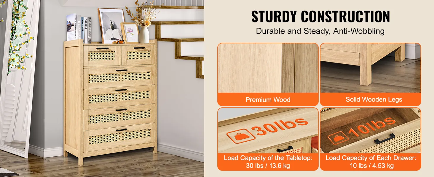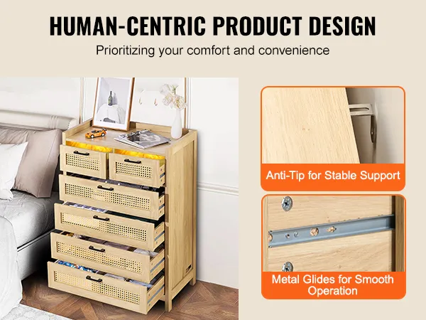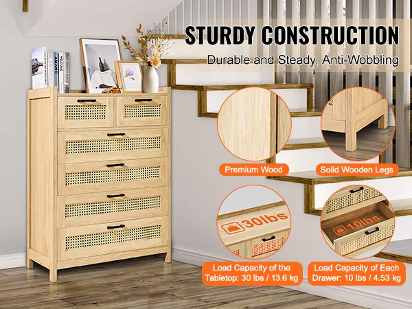 • Drošība pirmajā vietā: šī pītā kumode piedāvā sirdsmieru ar iebūvētu pretapgāšanās ierīci. Jūs varat paļauties, ka tā paliks stabila, pasargājot jūs un jūsu tuviniekus no negadījumiem. Vairs nav jāuztraucas par priekšmetu apgāšanos!