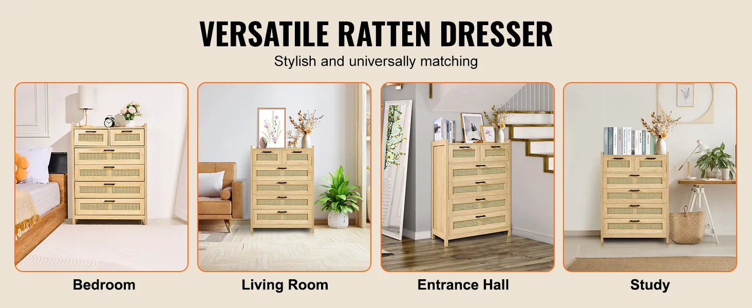 • Daudzpusīgs šarms: šī rotangpalmas kumode ir vairāk nekā tikai tualetes galdiņš, to var izmantot arī kā naktsskapīti, TV statīvu, drēbju organizatoru vai priekšnama galdiņu. Tas ir fantastisks veids, kā jebkurai telpai piešķirt eleganci!