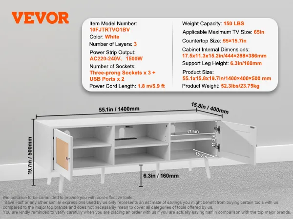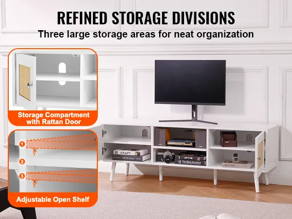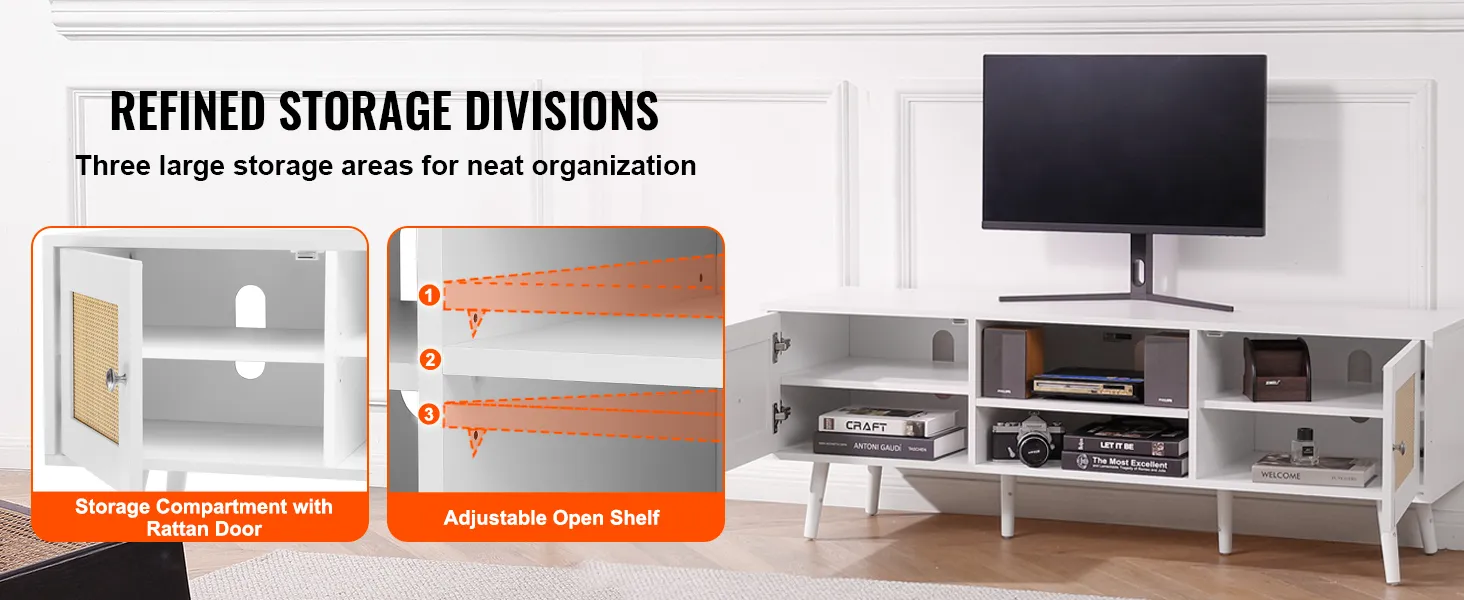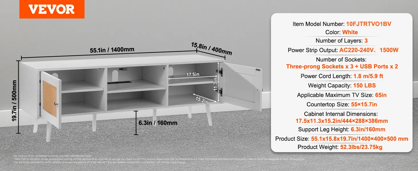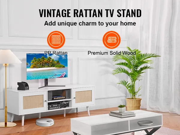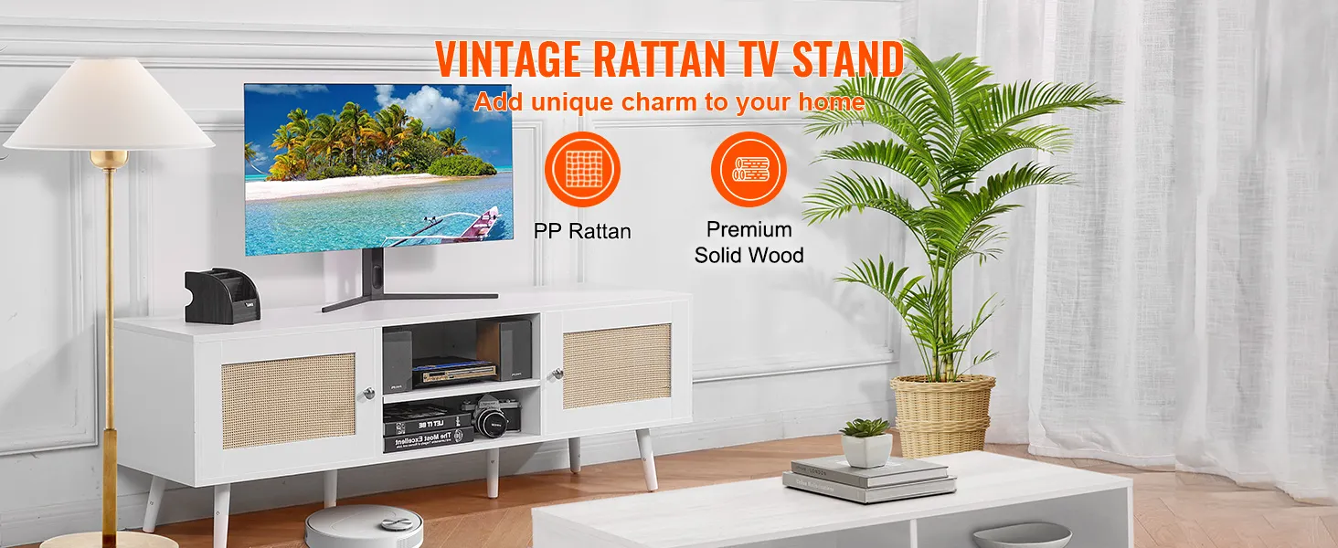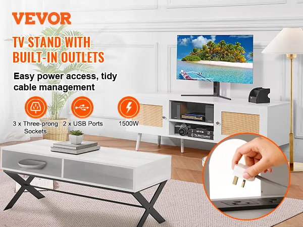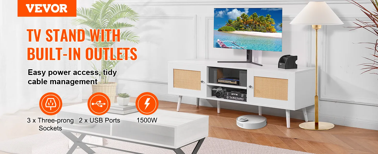 VEVOR Rattan TV Stand for 65 inch TV, Boho TV Stand with Rattan Door, Entertainment Center with Build-in Socket and USB Ports, Modern TV Console for Living Room, Media Room, White