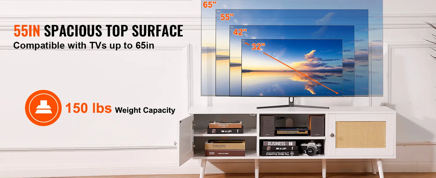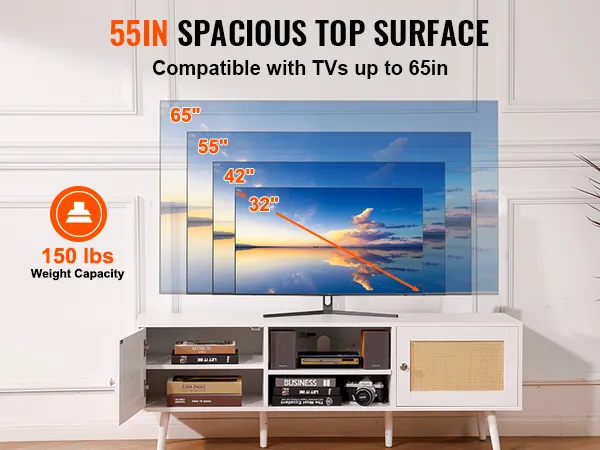The 55x15.7in tabletop accommodates a 65in TV and can hold up to 150 lbs. If you don't use it for a TV, the rattan entertainment center is also perfect for displaying decorative items.