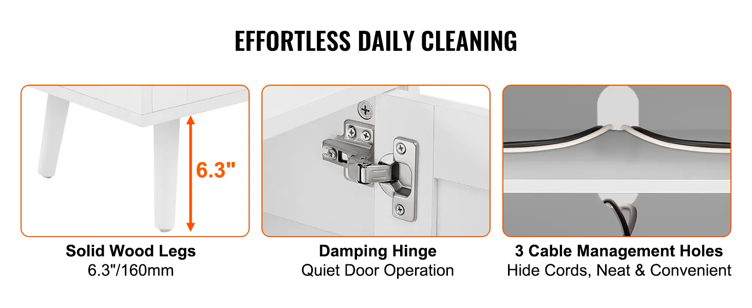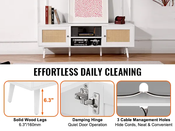 15 cm augstās masīvkoka kājas nodrošina pietiekamu atstarpi starp bohēmisko TV statīvu un grīdu, ļaujot robotam putekļsūcējam pārvietoties pa to. Trīs kabeļu pārvaldības caurumi nodrošina sakārtotu vadu izvietojumu, un eņģu slāpētāji nodrošina klusu durvju aizvēršanos.
