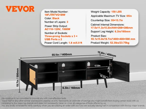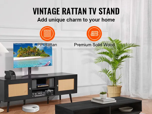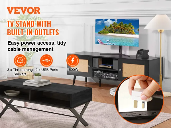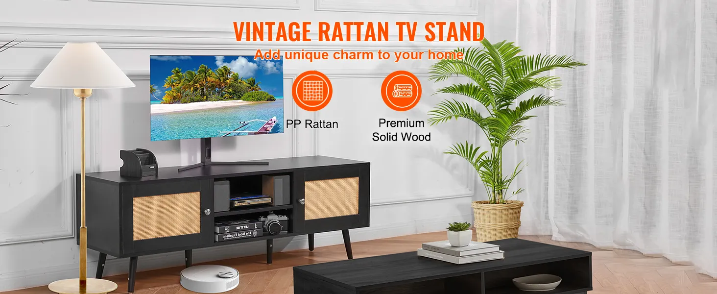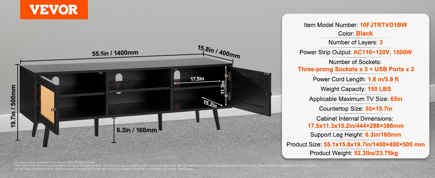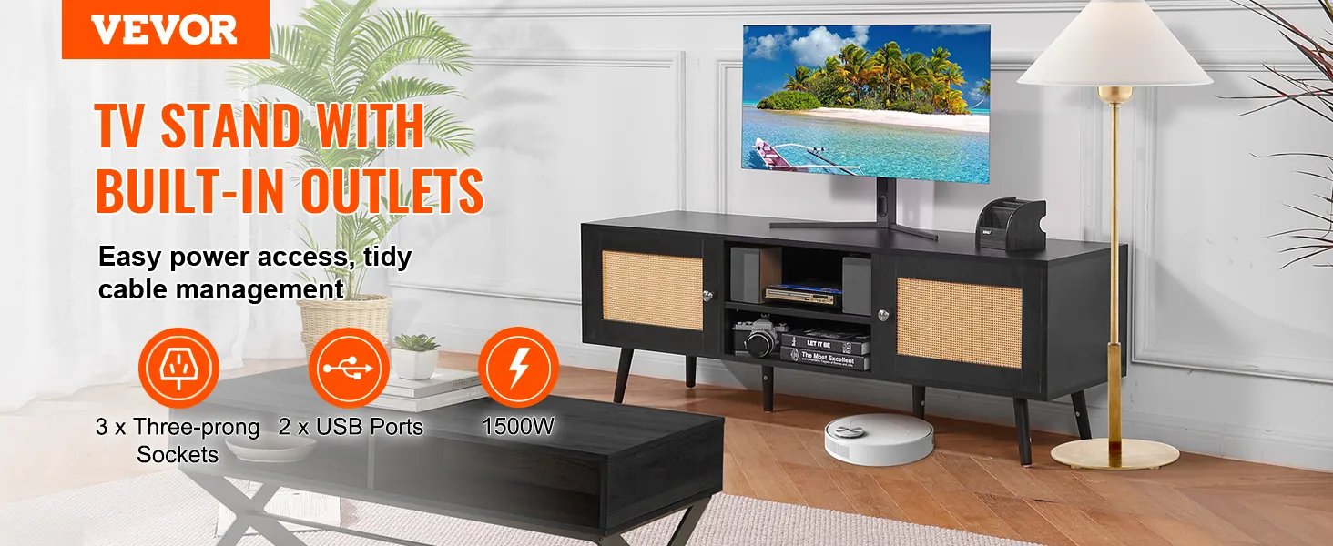 VEVOR Rattan TV Stand for 65 inch TV, Boho TV Stand with Rattan Door, Entertainment Center with Build-in Socket and USB Ports, Modern TV Console for Living Room, Media Room, Black