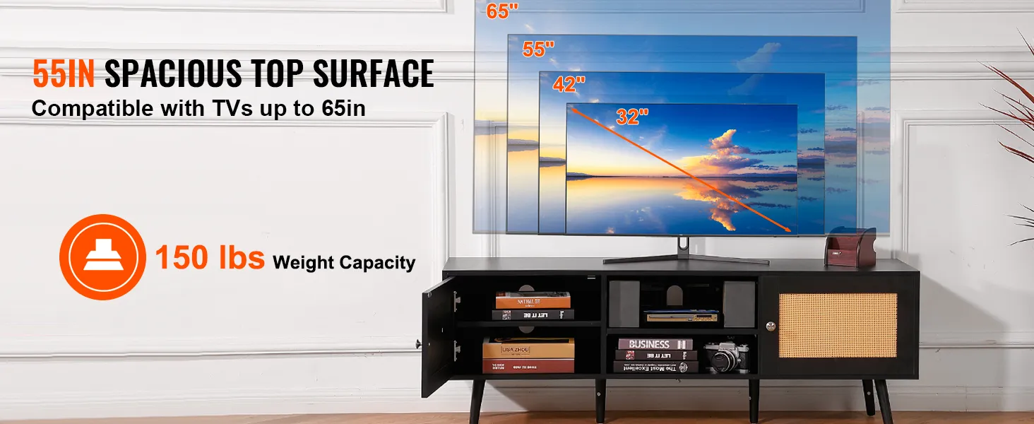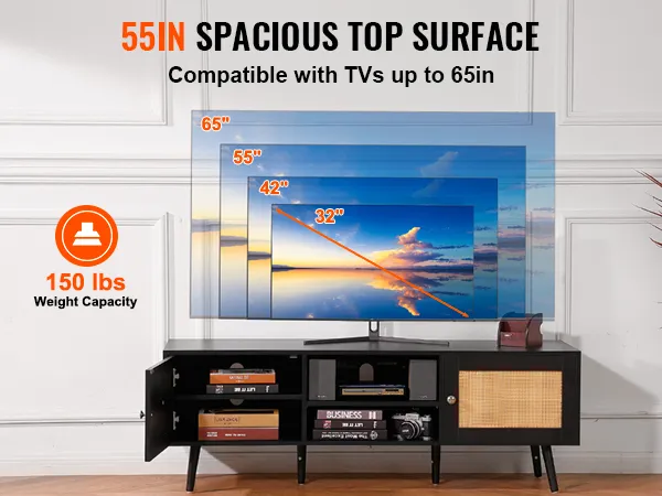 The 55x15.7in tabletop accommodates a 65in TV and can hold up to 150 lbs. If you don't use it for a TV, the rattan entertainment center is also perfect for displaying decorative items.