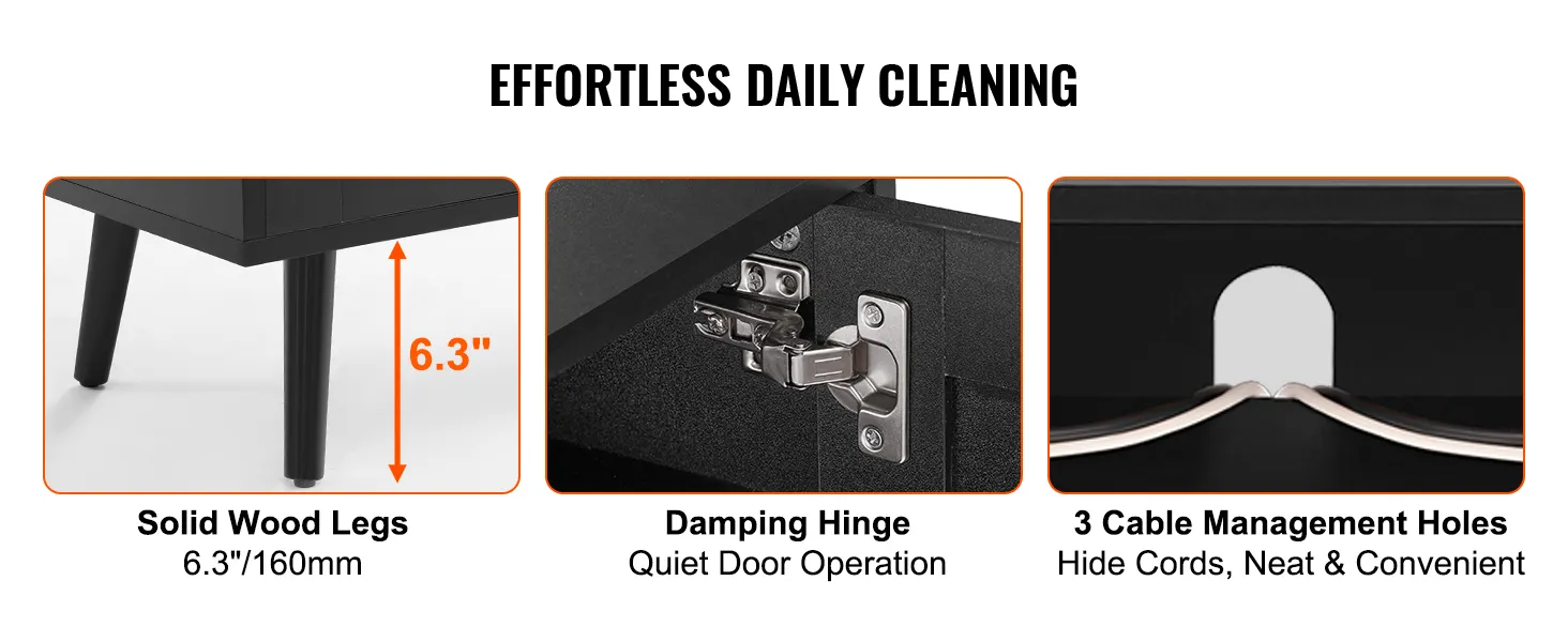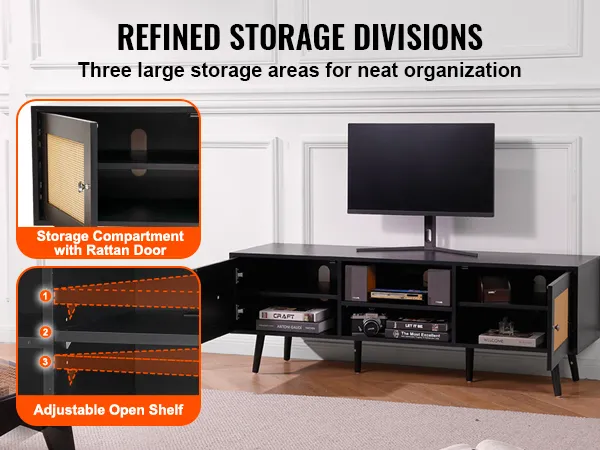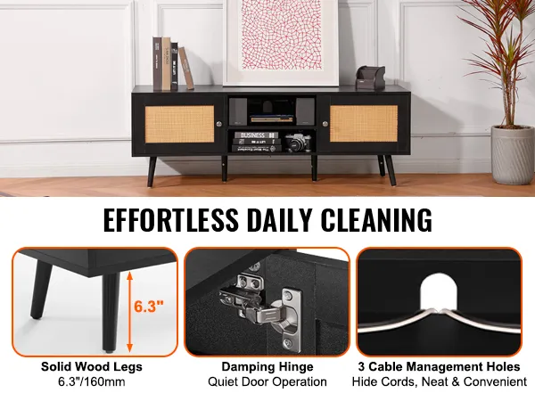 15 cm augstās masīvkoka kājas nodrošina pietiekamu atstarpi starp bohēmisko TV statīvu un grīdu, ļaujot robotam putekļsūcējam pārvietoties pa to. Trīs kabeļu pārvaldības caurumi nodrošina sakārtotu vadu izvietojumu, un eņģu slāpētāji nodrošina klusu durvju aizvēršanos.