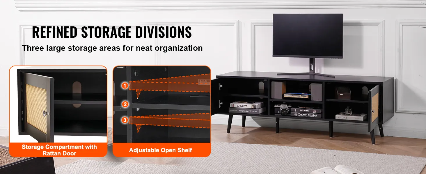 Abās pusēs ir lieli rotangpalmas uzglabāšanas skapīši privātumam un kārtībai. Vidējam atvērtajam plauktam ir regulējams augstums no 0 mm līdz 64 mm, nodrošinot piemērotu vietu DVD, audioiekārtu, kompaktdisku un grāmatu glabāšanai.