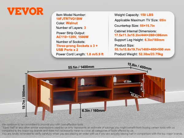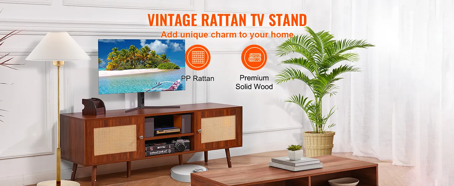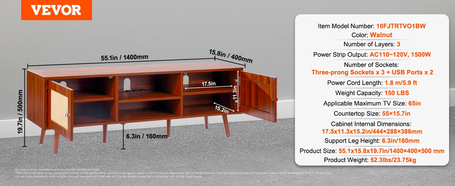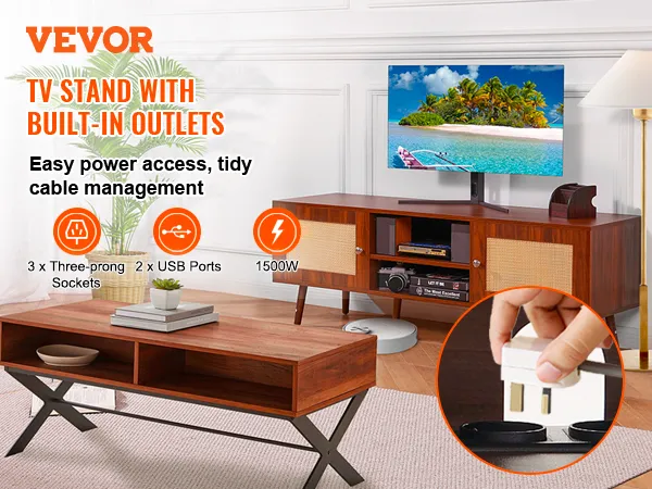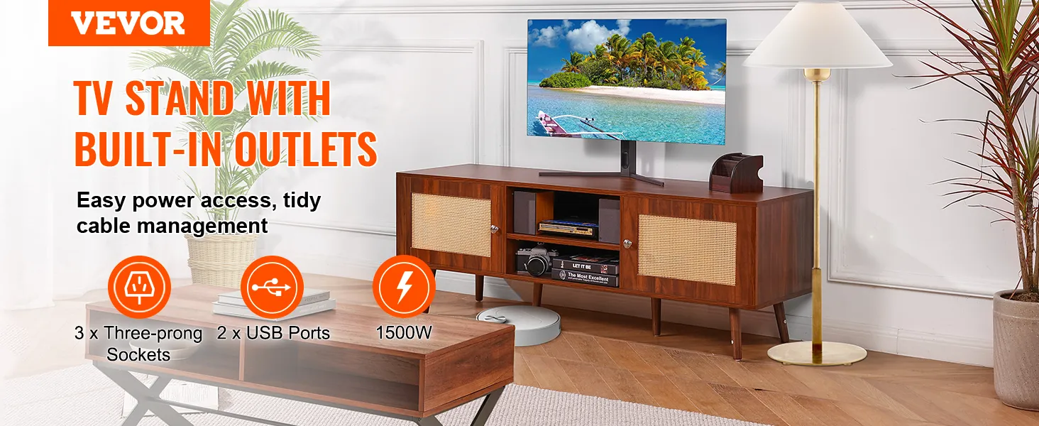 VEVOR Boho ratanas TV skapītis ar iebūvētu rozeti līdz 165 cm televizoram, valrieksta krāsa, regulējama uzglabāšana