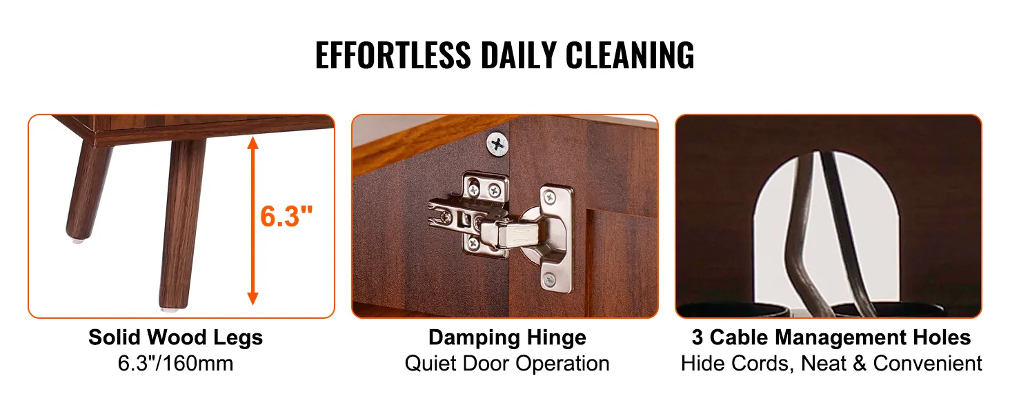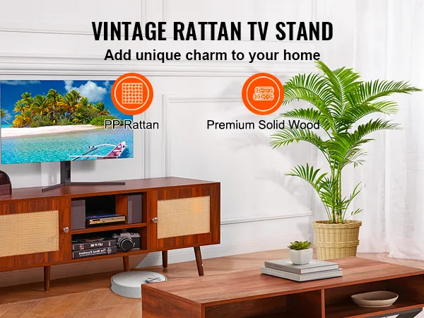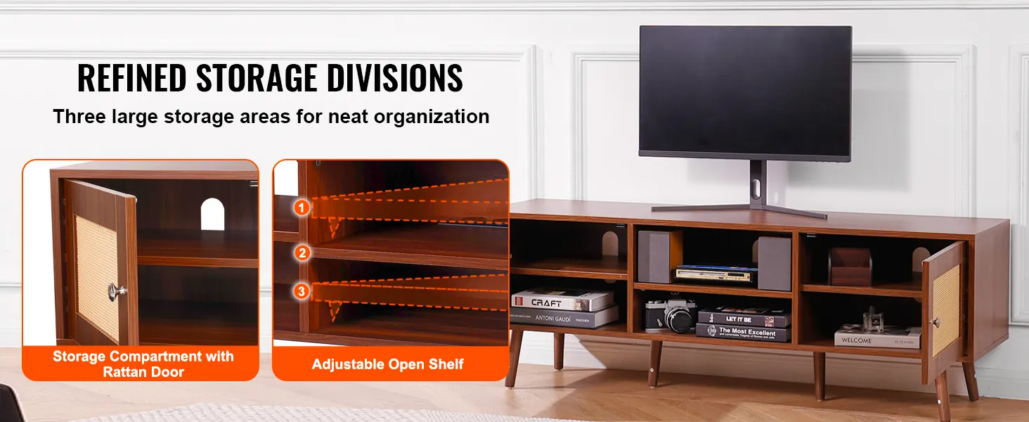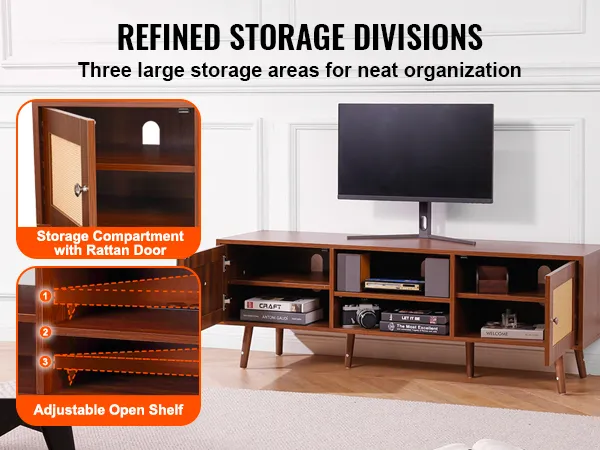 • Plaša un pielāgojama uzglabāšanas vieta: Ar lieliem uzglabāšanas skapjiem abās pusēs un rotangpalmas durvīm, rotangpalmas izklaides centrs piedāvā slēptu uzglabāšanas vietu, lai lietas būtu privātas un sakārtotas. Vidējam atvērtajam plauktam ir regulējams augstums no 0 mm līdz 64 mm, kas ļauj pielāgot uzglabāšanas vietu DVD diskiem, maršrutētājiem, audioiekārtām, kompaktdiskiem, grāmatām un citiem priekšmetiem.