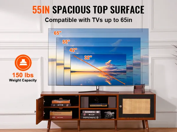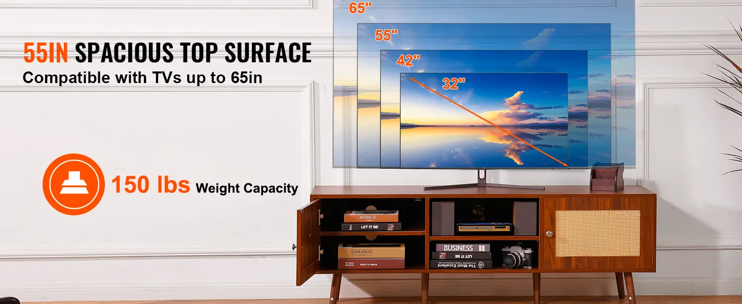 • Atbalsta 65 collu televizoru: Ar ietilpīgu 55 × 15,7 collu galda virsmu šis bohēmiskais TV skapītis var ievietot 65 collu televizoru, nodrošinot izcilu skatīšanās pieredzi, skatoties filmas vai spēlējot videospēles. Galda virsma var izturēt svaru līdz 150 mārciņām (75 kg), un uz tās var izvietot arī dekoratīvus priekšmetus un dažādus interesantus nieciņus.
