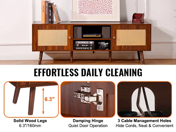 • Lietotājam draudzīgas detaļas: Piecas masīvkoka kājas nodrošina stingru atbalstu rotangpalmas TV skapītim, kura augstums ir 6,3 collas, nodrošinot pietiekamu brīvu vietu ikdienas tīrīšanai un ļaujot robotizētam putekļsūcējam viegli pārvietoties cauri. Trīs kabeļu pārvaldības caurumi palīdz paslēpt nekārtīgus vadus. Eņģēs izmantojam slāpētājus, lai samazinātu troksni un aizsargātu durvis, nodrošinot, ka tās aizveras klusi.