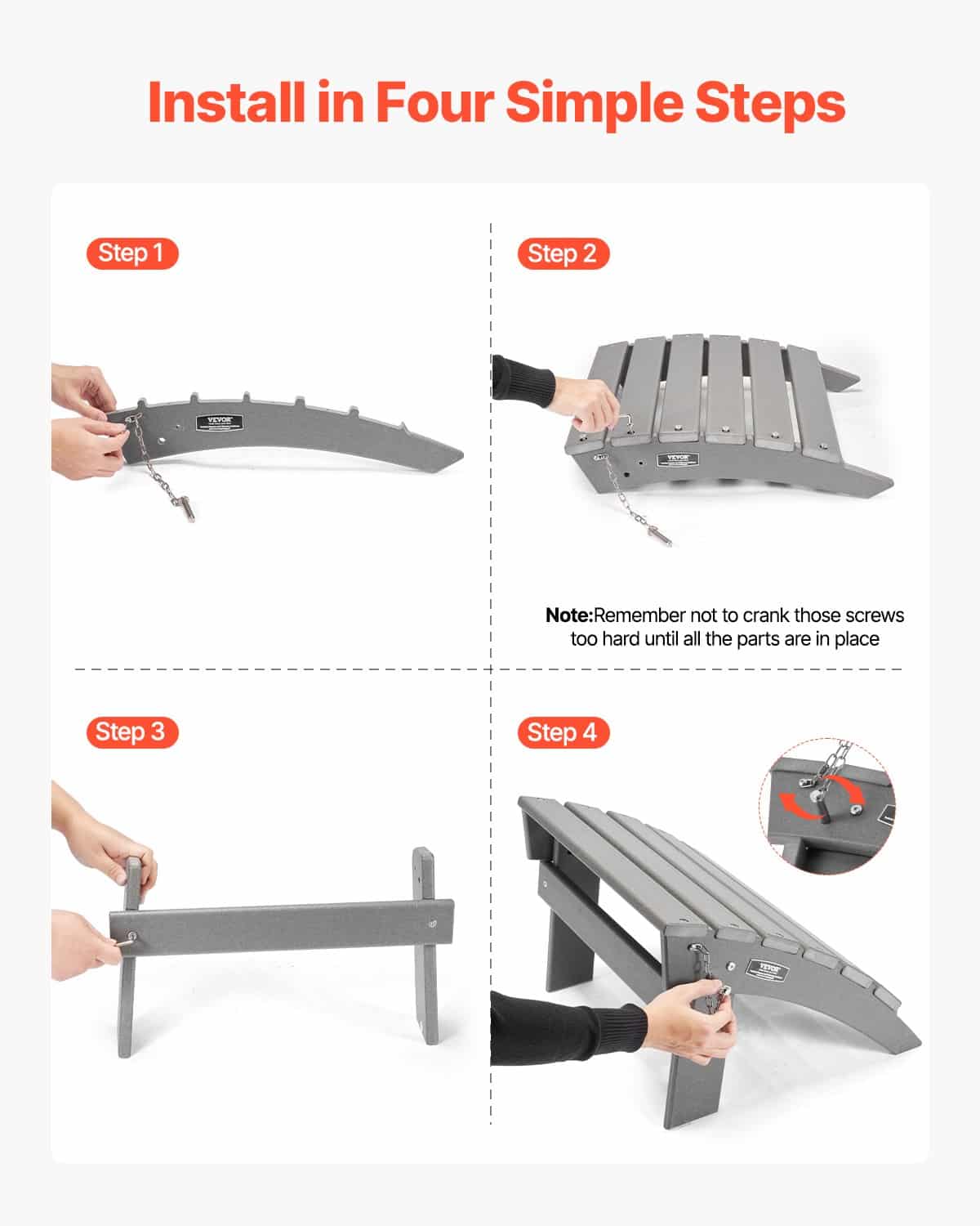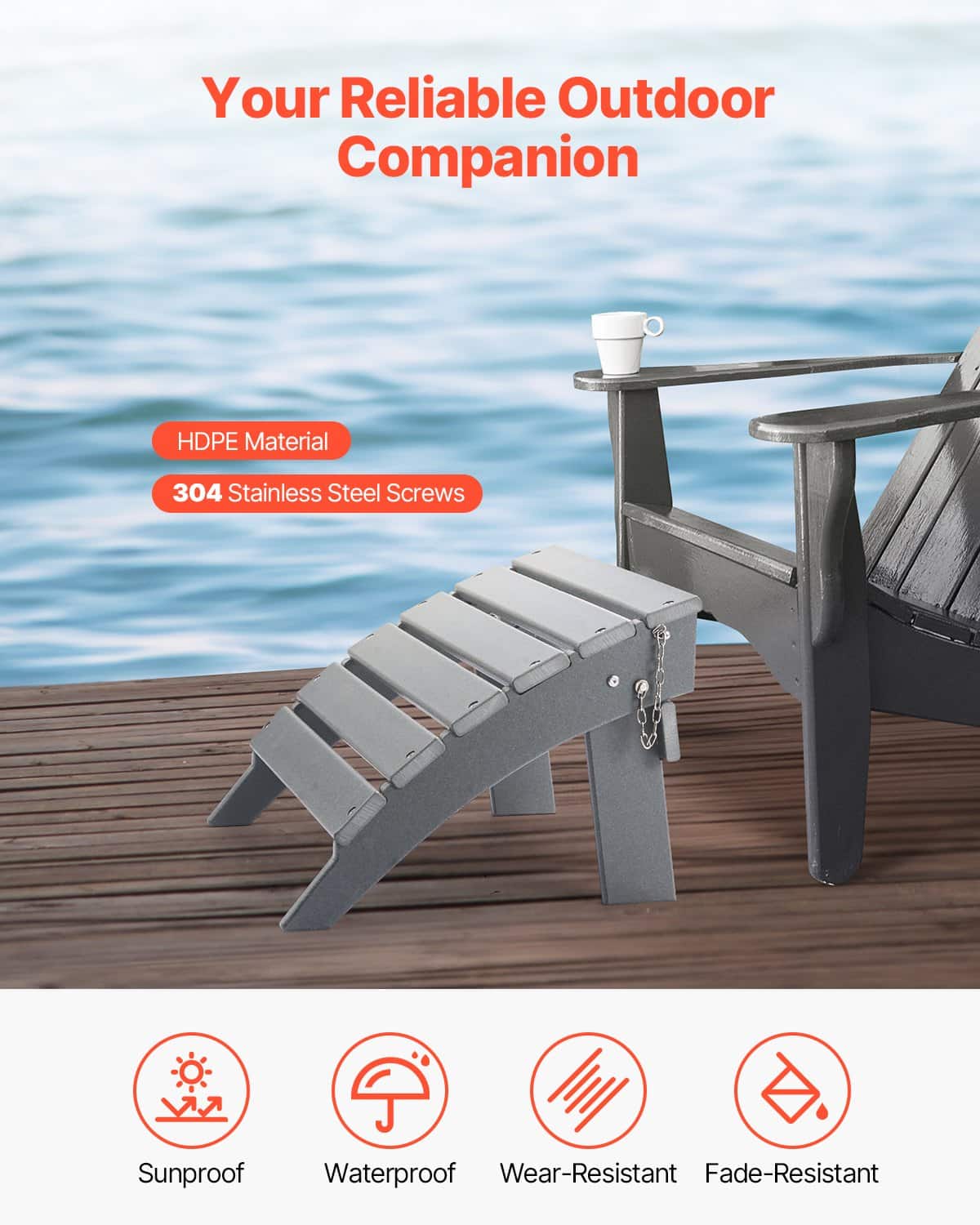 Salokāmais Adirondack pufs ideāli piestāv Adirondack krēslam, izmantojot 304 nerūsējošā tērauda skrūves, lai pasargātu to no rūsas. Trīsstūrveida dizains uzlabo stabilitāti, nodrošinot drošāku un ērtāku lietošanas pieredzi.