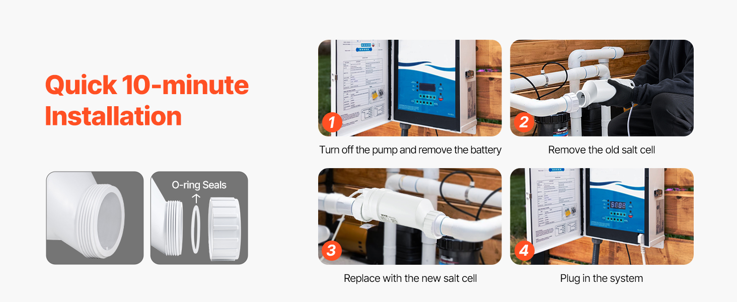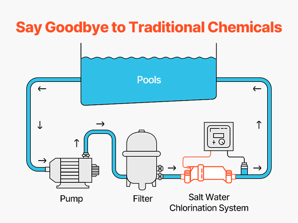 • Vienkārša baseina ūdens apkope: Izmantojot modernu elektrolītisko tehnoloģiju, baseina sāls hlorēšanas sistēma ģenerē hloru no sāls un titāna, novēršot nepieciešamību pēc dārgām hlora tabletēm. Atvadieties no acu kairinājuma un nepatīkamām smakām, kas rodas tradicionālajos hlora baseinos, vienlaikus baudot maigāku peldēšanās pieredzi.